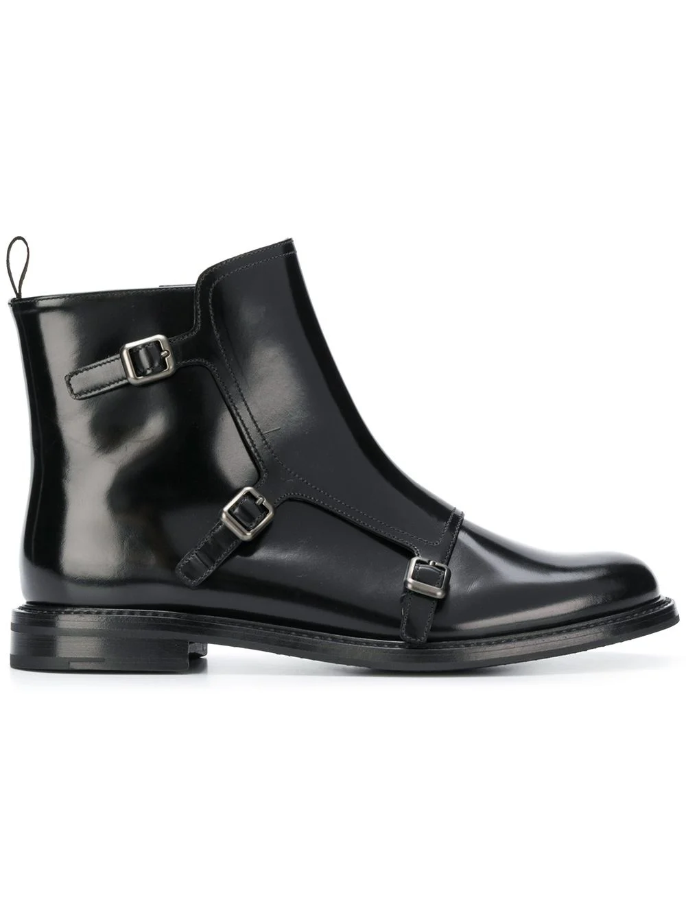 buckle ankle boots Black leather blend ankle boots from Church's featuring a round toe, a side zip fastening, a pull tab at the rear, a flat heel and buckle details at front. Composition Lining: Leather 100% Sole: Rubber 100%, Leather 100% Outer: Leather 100% SIZE & FIT Measurement Sole height 0.39 in(1 cm) HEIGHT 4.92 in(12.5 cm) HEEL 0.98 in(2.5 cm) CIRCUMFERENCE 10.62 in(27 cm)