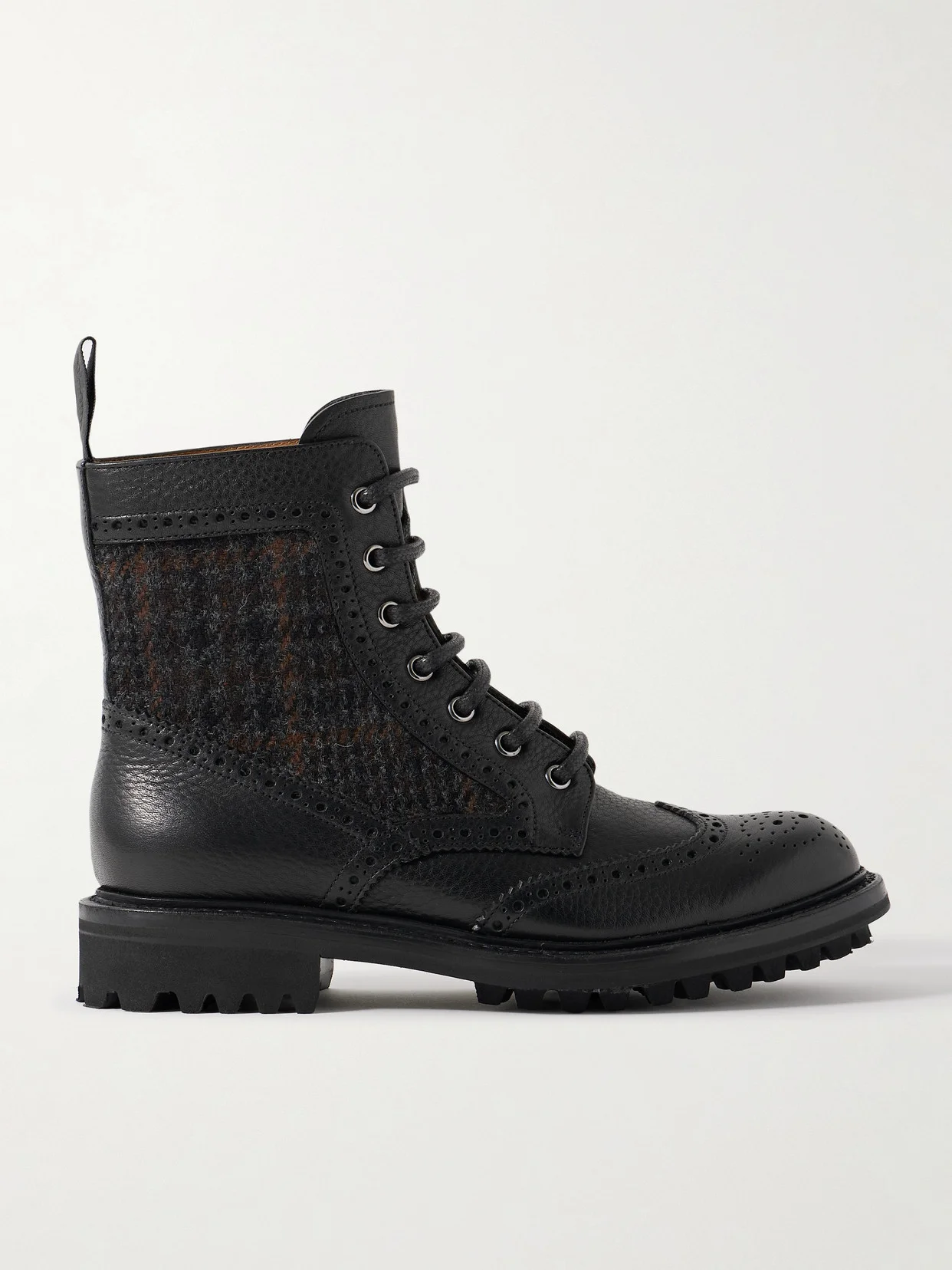 Church's' boots combine elements of cool combat styles and sophisticated brogues - the detailed perforations are executed by hand using techniques the brand has employed for centuries. They're made from smooth leather and have checked jacquard inserts and rubber lugged soles.