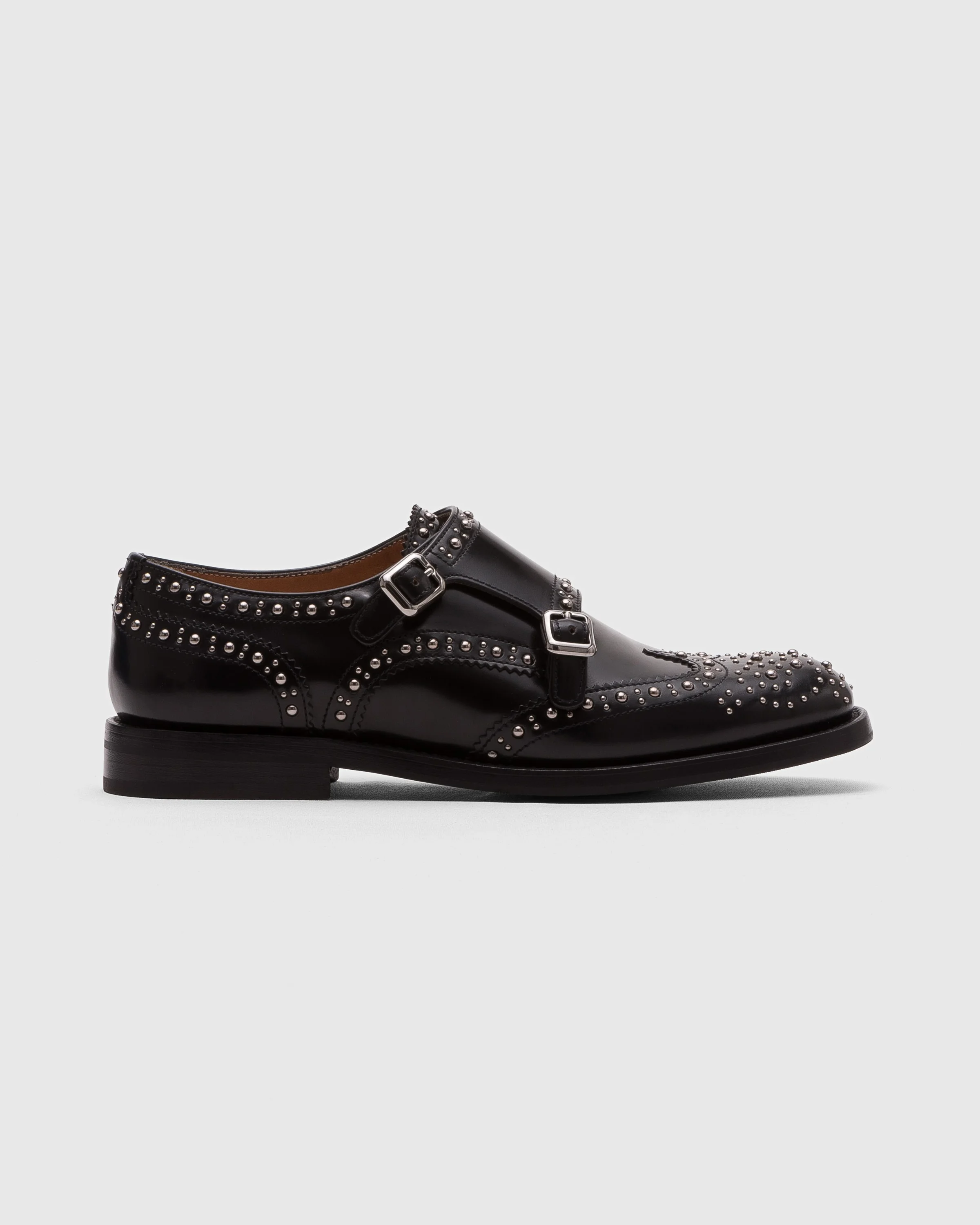 The Lana Met turns tradition on its head, spiking its classic double monk strap construction with punkish studs. Following the original brogue placements, the shiny metal highlights the subtle gimping details and the wing tip toe. Our polished binder treatment presents an additional layer of shine, buffed by hand to achieve a rich glossy look. Part refined and part anti-establishment, this shoe will inject a chic look with a courageous edge. Finished with a diamond rubber sole for added grip. • Product code: DO0002_9XV_F0AAB_F_B000 • Full brogue double monk strap--- • Calf leather with polished binder finish--- • Silver-tone buckles--- • Stud detailing--- • Diamond rubber sole--- • Internal lining for longevity of wear--- • Blake construction--- • Handwritten shoe info to lining--- • Church’s crest to sock and sole--- • We advise to purchase a half size smaller than your usual size • Imported product