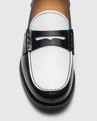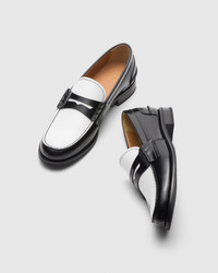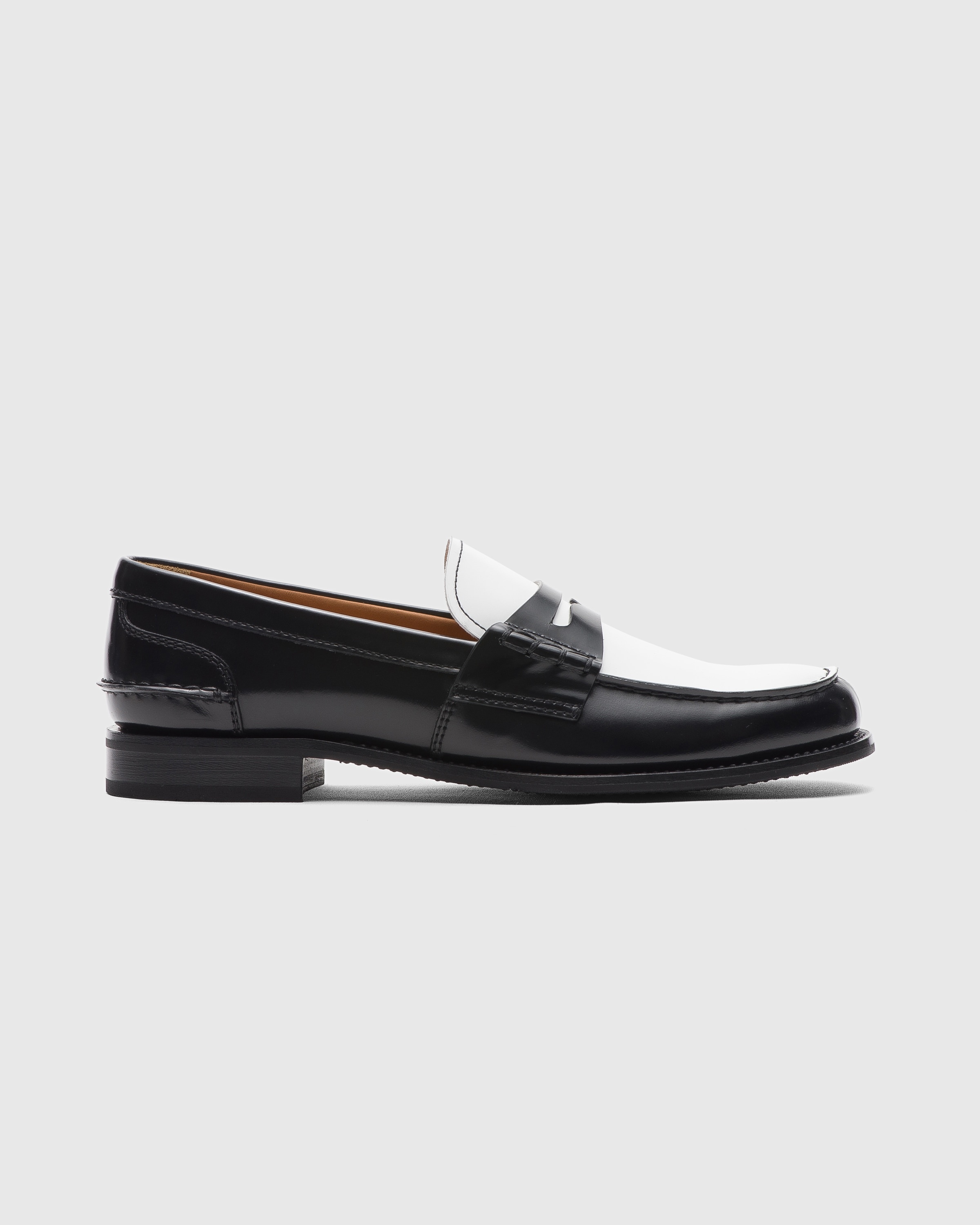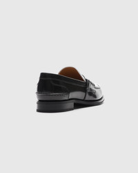 A polished fume finish, achieved by buffing the leather with abrasive brushes, adds intensity and character to refined brushed calfskin. A new take on a distinctive Church's design, the Pembrey W 5 loafer sports a lighter, elegant silhouette given by the Blake construction while maintaining all traditional details such as the hand stitching and smooth-edged tongue, revealing its artisanal nature. A true archetype of British style, the college-inspired penny loafer blends a spontaneous, youthful feel and sophisticated design, making it perfect for dandy and extravagant spirits, as well as for lovers of traditional and academic style. • Product code: DD0082_9AC0_F0ABU • College loafer with pinch stitching of the bowl • Hand-stitched strap with side stitching • Two-tone shiny smoked brushed calfskin upper • Non-slip rubber outsole • Blake construction • Church's logo on insole and outsole • Imported product
