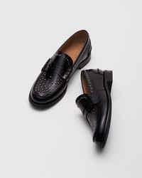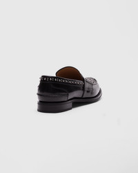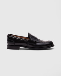 A true archetype of British style, Pembrey is the quintessential college-inspired penny loafer. It perfectly combines a spontaneous, youthful feel with a sophisticated design, perfect for dandy, extravagant spirits and lovers of traditional and academic styles. Enhanced by a precious, polished fume finish, the calfskin upper features silver-coloured studs for an unexpected accent reminiscent of London's youth subcultures. The hand-stitched seams and serrated edge reflect the attention to detail and high craftsmanship that have become synonymous with Church's. • Product code: DD0091_9EM_F0AAB • Penny loafer with hand stitch detail to sides • Polished fume calfskin • Silver-tone buckles • Internal heel support detail • Folded topline for maximum comfort • Non-slip rubber sole • Lined for maximum durability • Blake construction • Information on the hand-drawn shoe on inner vamp • Church's badge on insole and sole • Imported product