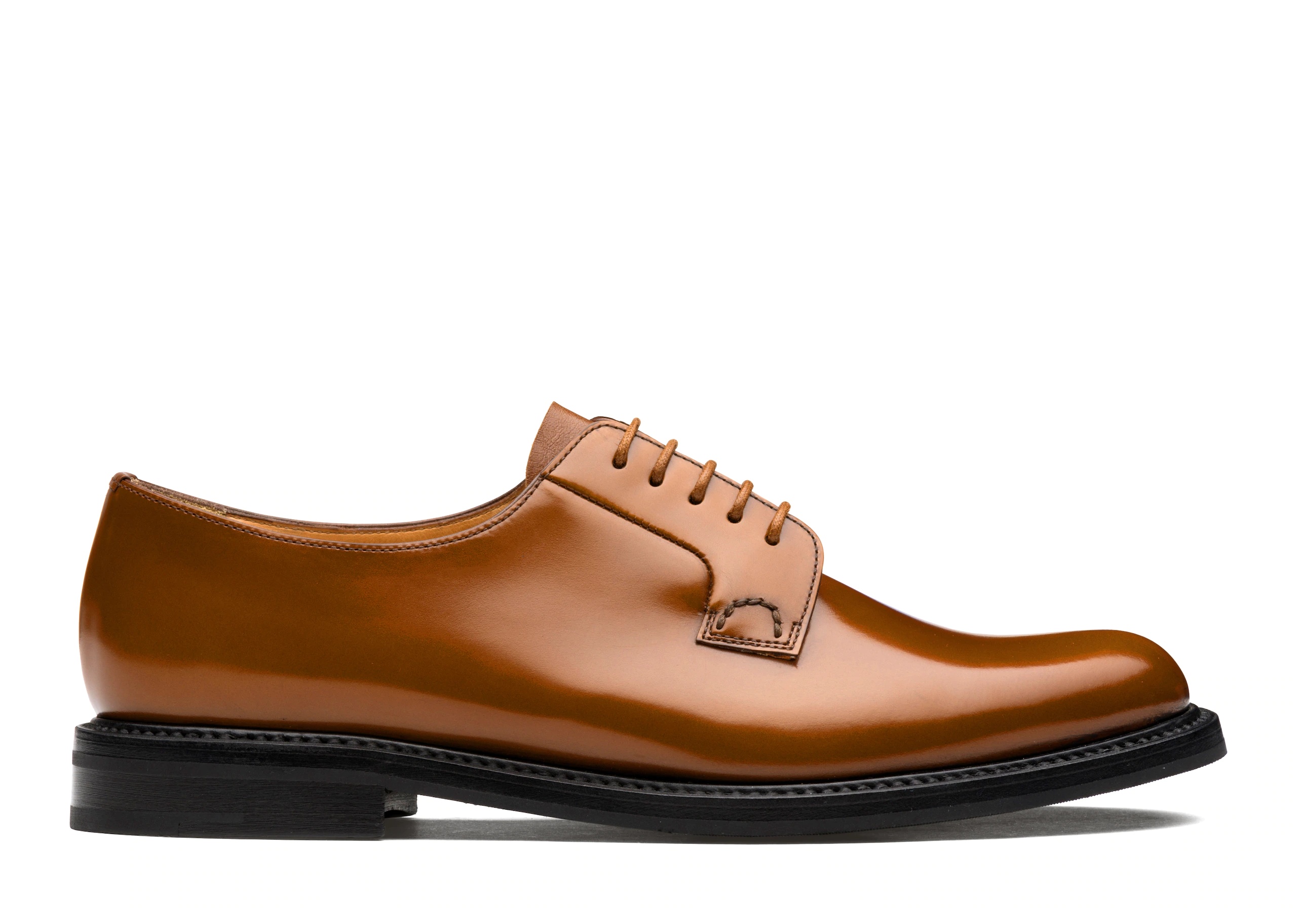 product details • Plain lace-up derby blucher with stitching to eyestay • Calf leather with polished binder finish • Half moon stitching detail to eyestay • Bellow tongue • Waxed cotton laces • Blind eyelets • Diamond rubber sole • Internal lining for longevity of wear • Blake construction • Handwritten shoe info to lining • Church’s crest to sock and sole