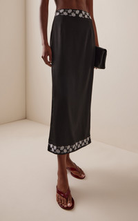 Those in the know have been staunchly following Lucy Akin’s rise—and with good reason: she captures an effortless L.A. cool that appeals to women all over. The Elly Skirt is a high waisted black satin midi length column skirt. Featuring a back zip and white floral embroidery at the waist and bottom hemline, pair the Elly with our matching Arlene Jacket for the chicest holiday ensemble. PRODUCT DETAILS - Fall '25 - Zip fastening - Composition: 100% polyester - Dry clean - Imported