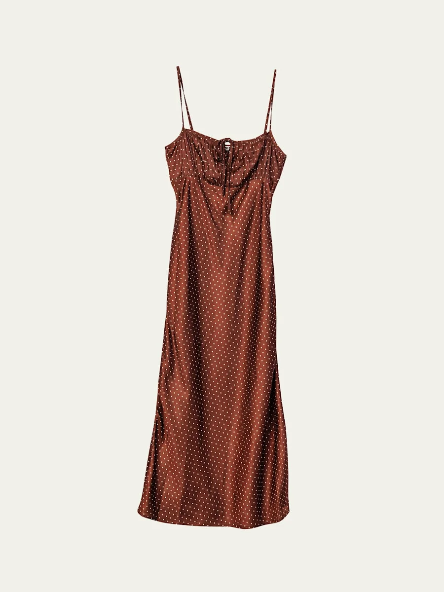Ciao Lucia "Leo" satin midi dress in polka dot Scoop neckline with self-tie Sleeveless Empire waistline Slip silhouette Hem falls below the knee Slipover style Polyester Dry clean Imported Online Inquiries: BGS21_T6VWR| Store Inquiries: #5046380