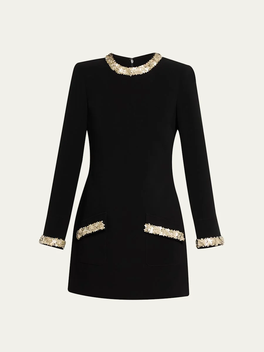 Crafted from matte crepe, the "Adi" mini dress by Cinq a Sept features intricate floral embellished trim for a modern, sophisticated silhouette Crew neckline Long sleeves with vented cuffs; approx. 32"L Patch pockets Sheath silhouette Hem falls above the knee Center back zip Triacetate/polyester Lining: Polyester Dry clean Imported