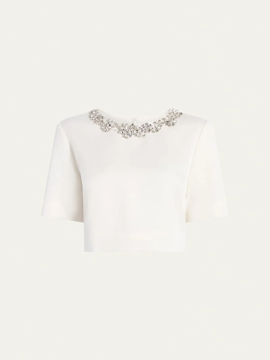 Cinq a Sept "Adona" crepe top finished with crystalembellished trim for a touch of glamour. Crew neckline Short sleeves Tailored fit Cropped length Back button closure Acetate/polyester Unlined Lining: Unlined Dry clean Imported