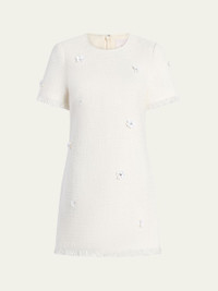 Crafted from woven tweed, this Cinq a Sept mini dress boasts a sophisticated silhouette adorned with 3D floral applique and delicate eyelash fringe trim, creating a feminine look. Crew neckline Short sleeves Sheath silhouette Hem falls above the knee Center back zip Cotton Fully lined Dry clean Imported