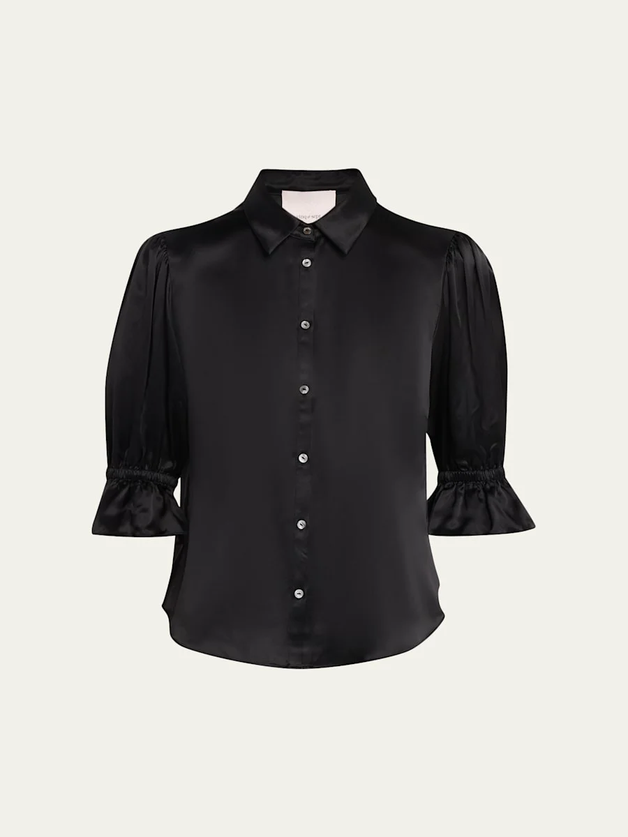 Cinq a Sept "Fiona" satin blouse complete with cinched ruffle cuffs Spread collar; button placket Short puff sleeves Slim fit Yoked back Curved hem Silk Dry clean Imported