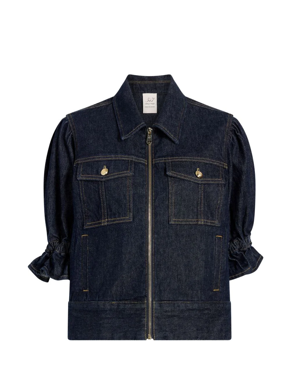 Holly ruffled puff-sleeve denim jacket Highlights - Blue - Puff sleeves - Front pockets - Gold-tone hardware - Zip fastening Imported Composition Cotton 88%, Recycled Cotton 11% Washing instructions Read Manufacturer Guidelines
