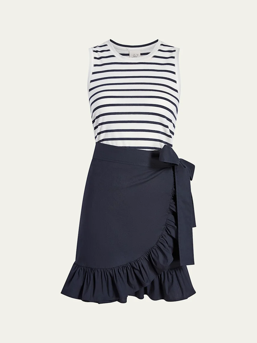Cinq a Sept "Mahlia" combo dress finished with ruffled trim Crew neckline Sleeveless Side waist tie Shirtdress silhouette Hem falls above the knee Slipover style Cotton Dry clean Imported