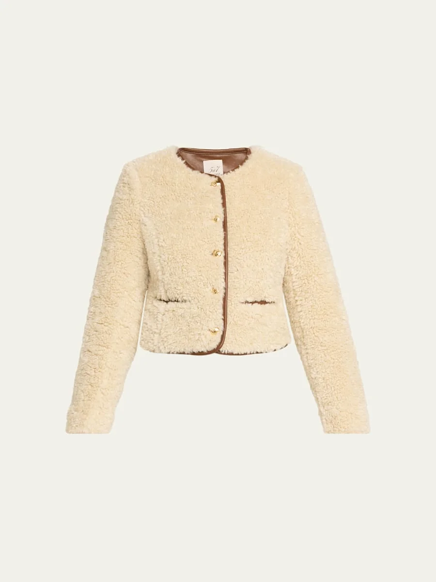 Crafted in plush faux fur (polyester), the "Naia" jacket by Cinq a Sept offers a cozy silhouette with faux leather trim for a seamless finish. Round neckline Long sleeves; approx. 34"L Welt pockets Boxy fit Cropped length Buttonfront Polyester Lining: Polyester Dry clean Imported