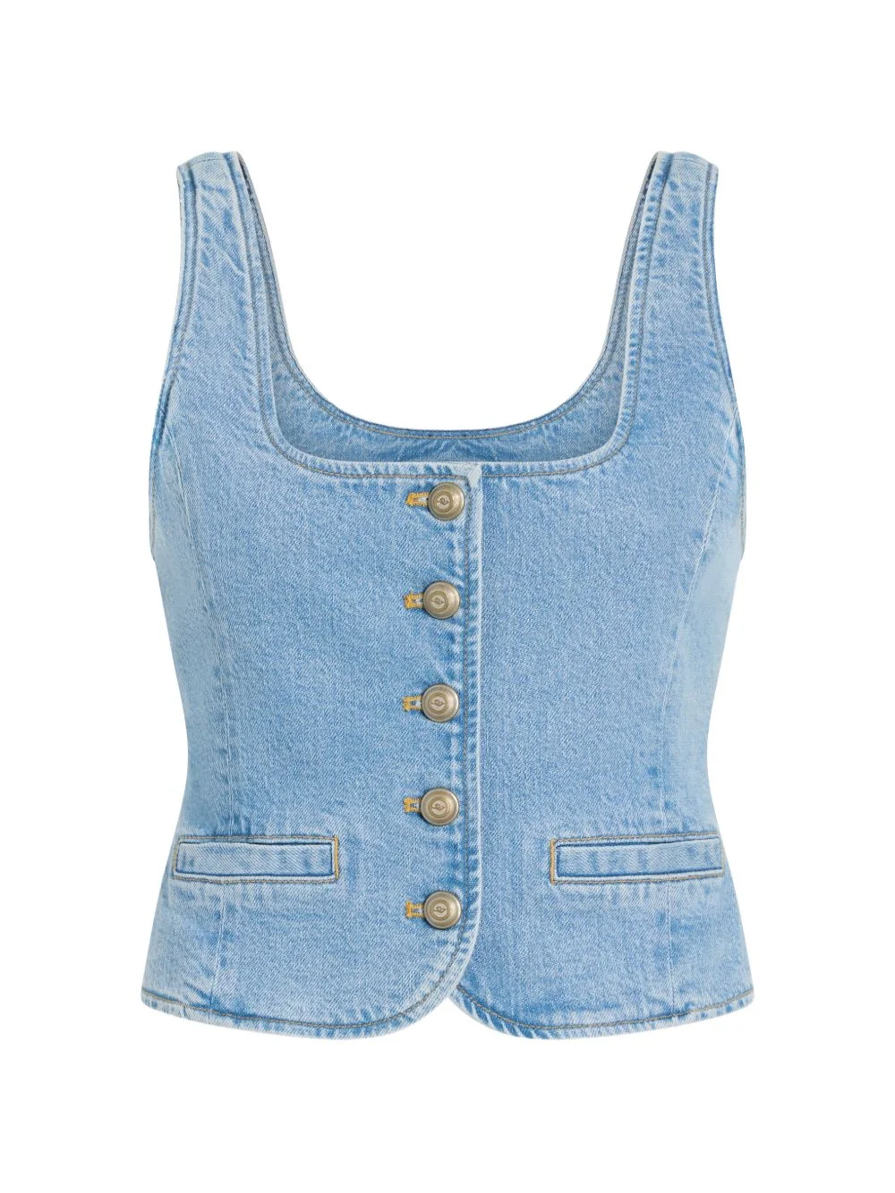 Rowena button-up denim top Highlights - Light blue - Button fastening - Square neck - Pocket detail - Sleeveless - Curved hem Imported Composition Cotton 59%, Lyocell 40%, Elastane 1% Washing instructions Machine Wash