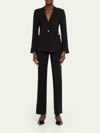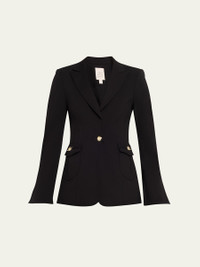 Crafted in stretch fabric, the "Sable" blazer by Cinq a Sept features a tapered waist and silvertone button details for a sleek silhouette. Peak lapels Singlebreasted front Long sleeves with split cuffs; approx. 32.3"L Slim fit Vented back Single buttonfront Rayon/cellulose acetate/nylon/polyamide/spandex Lining: Polyester Dry clean Imported