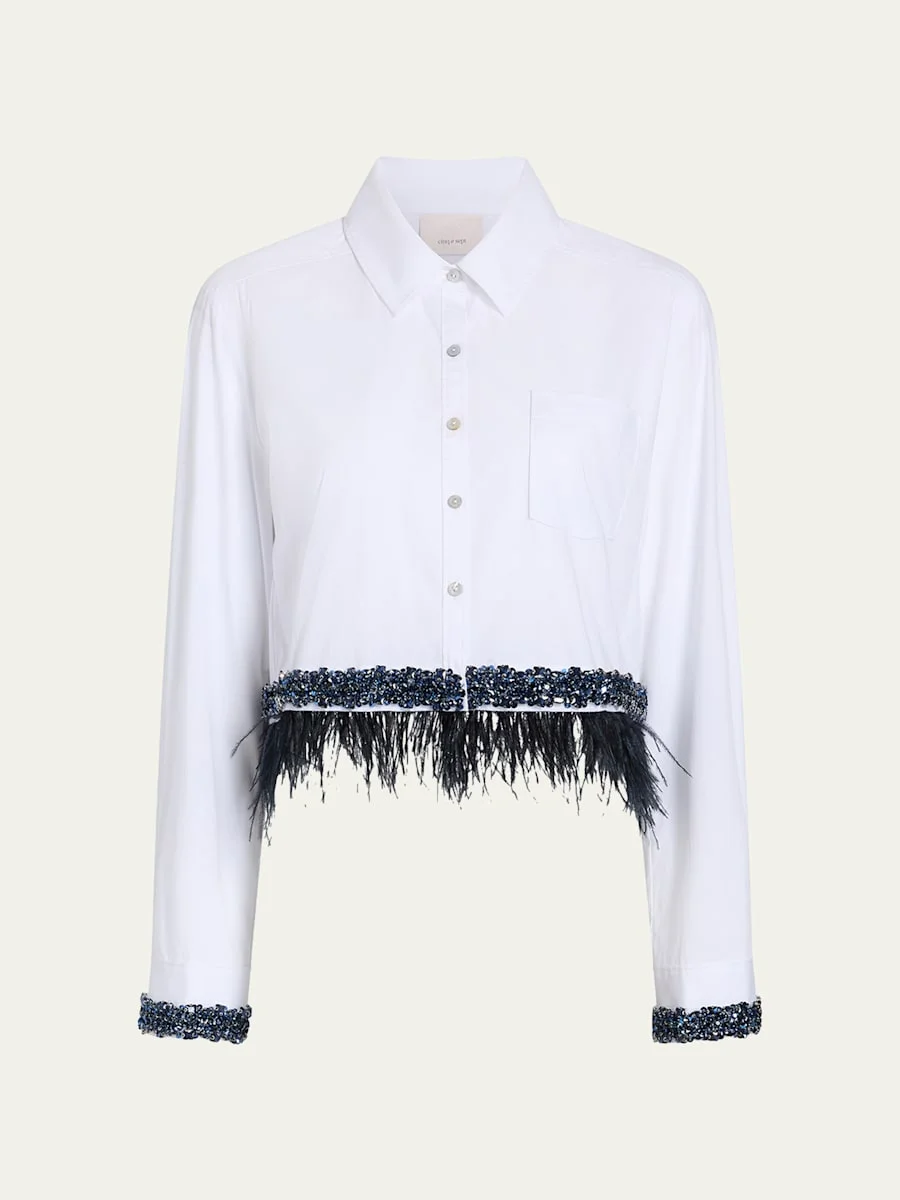 Crafted from crisp cotton poplin, the "Sylvan" shirt by Cinq a Sept features shimmering beads and feathered trim for a glamorous take on a classic silhouette. Point collar Long sleeves with button cuffs Chest pocket Classic fit Cropped length Buttonfront Cotton/spandex Dry clean Imported
