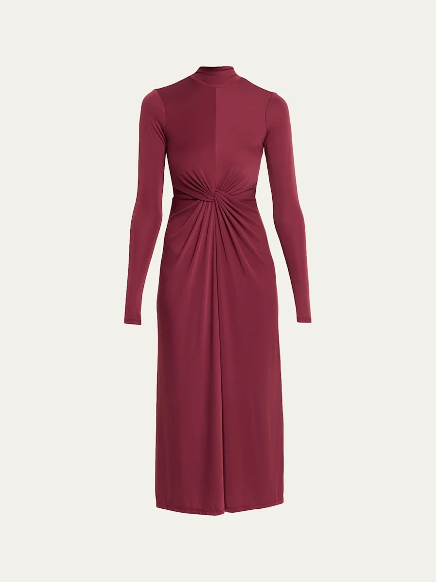 Crafted from soft stretchjersey, the "Tovianna" midi dress by Cinq a Sept is adorned with a flattering twistfront for an effortless silhouette. Turtleneck Long sleeves; approx. 34.5"L Slim silhouette Hem falls below the knee Invisible back zip Polyester/spandex Unlined Dry clean Imported