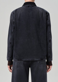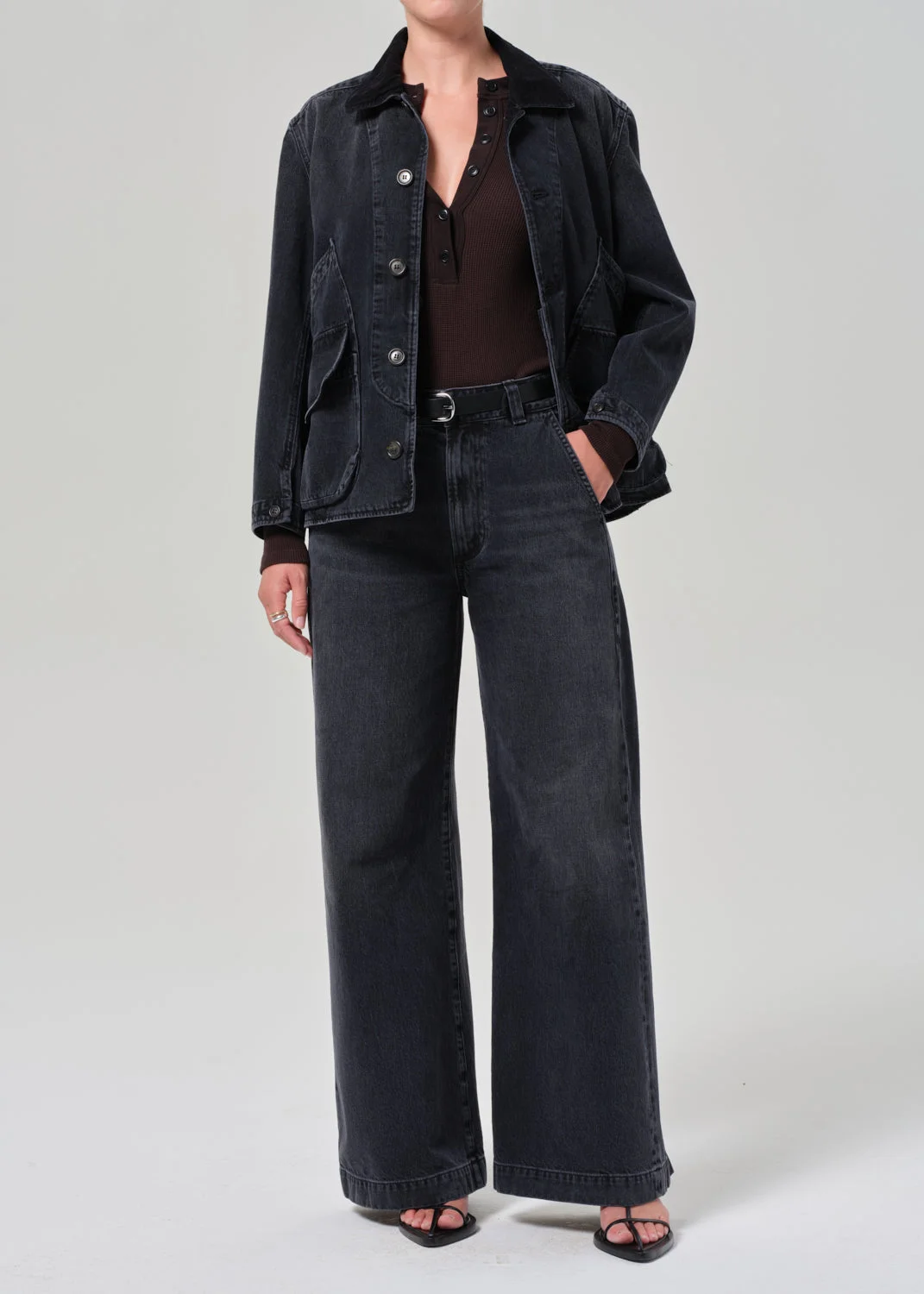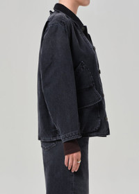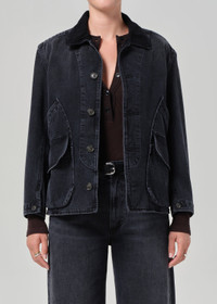 A modern take on classic workwear. The Abra Work Jacket, crafted in a washed black denim, channels timeless workwear aesthetics with thoughtful detailing. Made from 100% regenerative cotton, this jacket features functional pockets and a structured fit, blending practicality with polished style. Whether layered over casual pieces or worn as a standout statement, it’s a versatile addition to any wardrobe, designed to elevate both form and function. This fit is true to size. Argent and Citizens of Humanity reunite for Good Work: Collection Two a capsule that builds on the brands’ shared mission to shape a better future—one that is responsibly crafted and empowers women to look and feel their best. Built on a foundation of sustainable and regenerative materials, Collection Two reimagines tailored denim silhouettes in deep washes; rich seasonal shades of tobacco and cocoa, and a fresh approach to classic suiting, round out the assortment. Designed to move seamlessly from the workplace to life beyond, the capsule reinforces a modern uniform for all facets of life.. DETAILS Chest: 50 1/4" Body Length: 28" Sleeve Length: 23 1/2" Fabric: Shell: 100% Regenerative cotton Care Instructions: Machine wash cold inside out with like colors. Tumble dry low. Do not bleach. Made in USA with imported materials 5146-3007_MPOLI