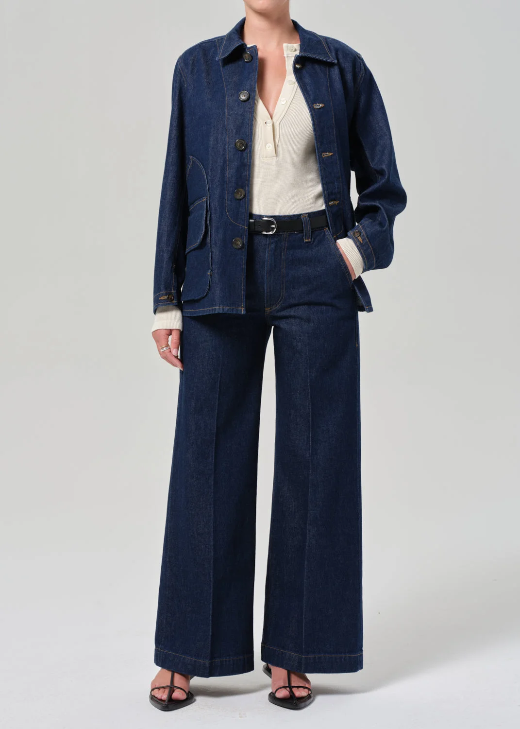A modern take on classic workwear. The Abra Work Jacket, crafted in a rich rinse indigo, channels timeless workwear aesthetics with thoughtful detailing. Made from 100% regenerative cotton, this jacket features functional pockets and a structured fit, blending practicality with polished style. Whether layered over casual pieces or worn as a standout statement, it’s a versatile addition to any wardrobe, designed to elevate both form and function. This fit is true to size. The Citizens of Humanity x Argent collection unites two brands driven by a shared commitment to responsible design, sustainability, and empowering women. Crafted for a modern wardrobe that transitions seamlessly from work to life, the collection features elevated, versatile pieces made with sustainable materials such as regenerative cotton and bio indigo dye. More than clothing, this collaboration is a call to action—championing values that matter and inspiring women to advocate for a more sustainable future. This product is made with regenerative cotton from Citizens of Humanity Group’s Regenerative Cotton Program. Our program collaborates closely with farmers both domestically and internationally, nurturing growth, fostering education, and encouraging the widespread adoption of regenerative agricultural practices. DETAILS Chest: 47 1/2" Body Length: 27 1/2" Sleeve Length: 23 3/4" Fabric Content: Shell: 100% Regenerative cotton Care Instructions: Machine wash cold with like colors, inside out, do not bleach, tumble dry low, iron medium if necessary, if decorated or printed do not iron. Made in USA with imported materials 5146-1810_SUMMI