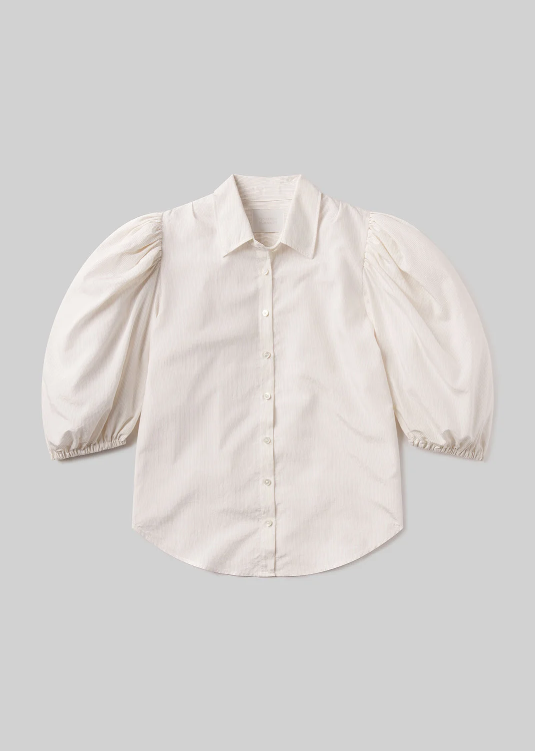 The Anya Puff Sleeve Blouse is a romantic update to a classic button-up, cut from an ultra-soft Italian lightweight shirting that drapes effortlessly. Designed with soft puff sleeves and a clean silhouette, it delivers subtle drama with everyday ease. Style it tucked into denim or worn loose for a more relaxed take. This fit is true to size. Looks Like: Light beige and white micro stripe puff sleeve shirt Feels Like: Soft, smooth, and comfortable lightweight shirting with a bit of stretch and resilience From our HUMANITY Collection DETAILS Body Length: 26 1/2" Chest: 45" Sleeve Length: 30" Model is 5'10" and wearing a size Small Fabric Content: 77% Modal 15% Polyamide 8% VIscose Care Instructions: Machine wash cold inside out with like colors. Do not bleach. Tumble dry low. Made in USA with imported materials 9486-1931_SDMTR