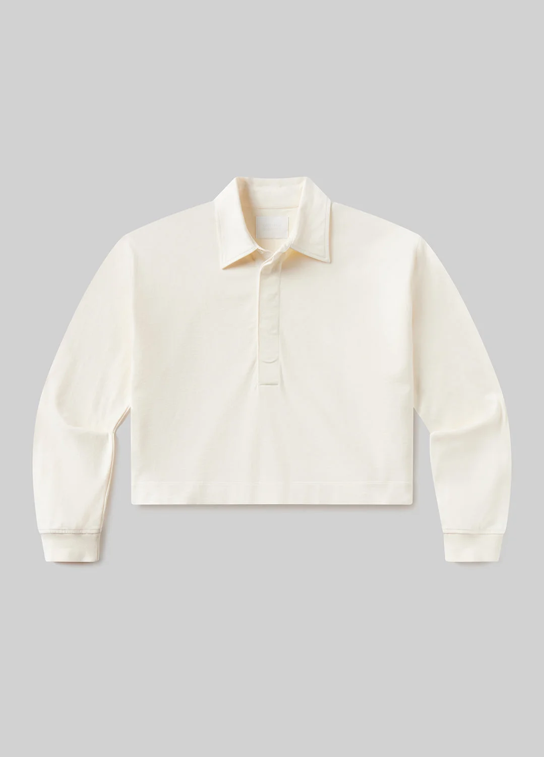 Understated and refined, the Aris Rugby is cut from luxe cotton with an ultra-soft hand. The off-white Pashmina shade pairs seamlessly with a crisp white collar, delivering a clean, tonal take on the classic rugby silhouette. Effortless with vintage denim or tailored separates. This fit is true to size. Looks Like: Off white rugby shirt with white collar detailing Feels Like: Luxe cotton made with a soft hand feel From our HUMANITY Collection DETAILS Body Length: 22 1/8" Chest: 47 1/2" Sleeve Length: 23 1/4" Model is 5'10" and wearing a size Small Fabric Content: 100% Cotton Care Instructions: Machine wash cold. Made in Portugal with imported materials 9421_PMINA