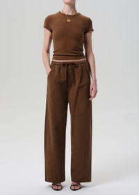 The ‘Aurora’ pant is crafted from an airy Italian twill—a refined blend of cotton and flax that offers a soft hand and fluid drape. Designed with a high-rise waist, drawstring closure, and full-length wide leg, it delivers effortless ease with tailored polish. The deep bronze hue brings warmth and dimension to transitional styling. Pair with a tonal top or crisp button-down for an understated, modern set. This fit is true to size. Looks Like: Dark copper pull on pant with drawstring at the waistband Feels Like: An airy yet soft flax and cotton blend with the right amount of drape From our HUMANITY Collection DETAILS Rise: 13" Inseam: 29 1/2" Leg Opening: 22" Model is 5'10" and wearing a size Small Fabric Content: 79% Cotton 21% Flax Care Instructions: Machine wash cold inside out with like colors. Do not bleach. Tumble dry low. Made in USA with imported materials 2186-1506_BRNZE