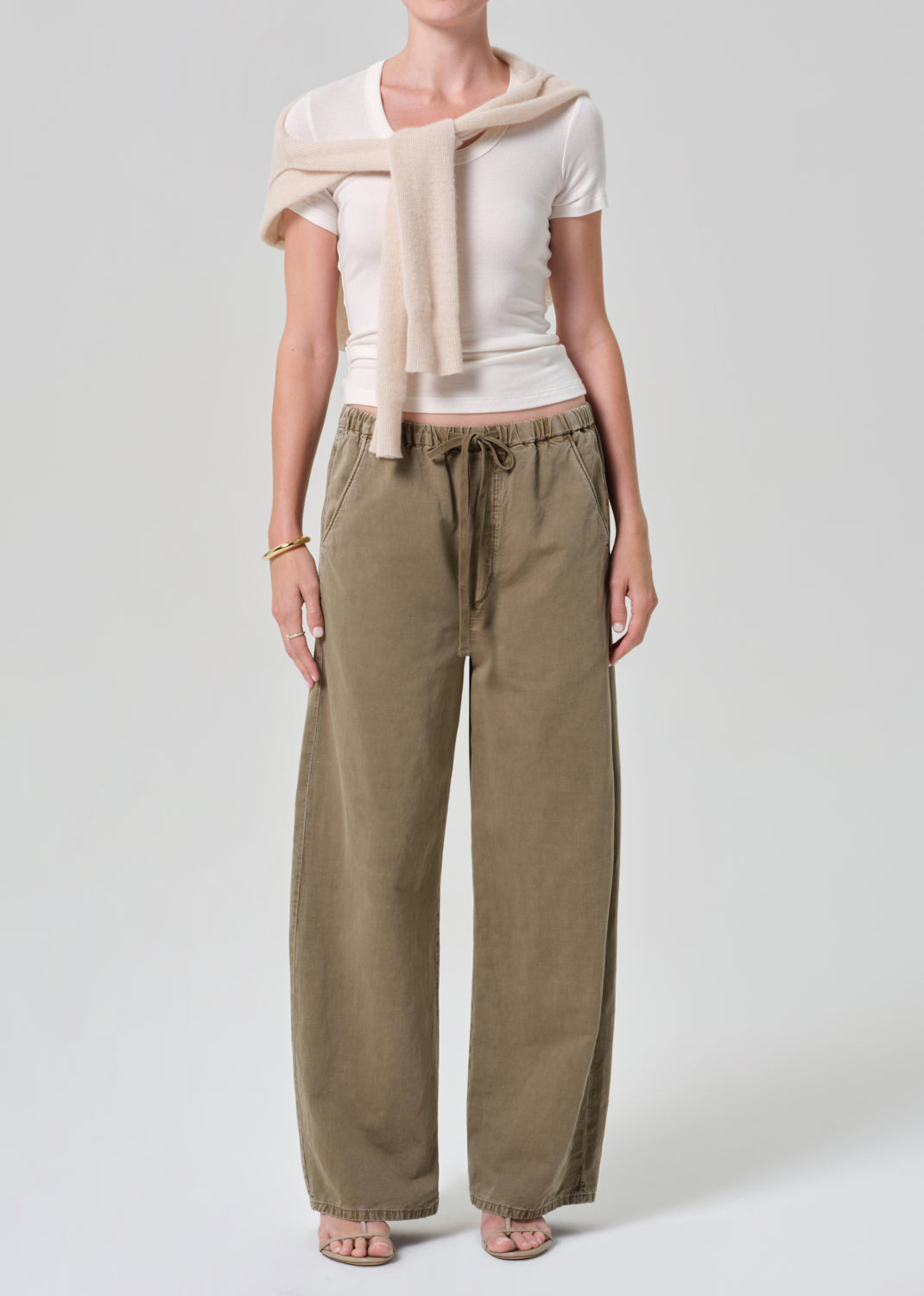 The ‘Aurora’ pant is crafted from an airy Italian twill—a refined blend of cotton and flax that offers a soft hand and fluid drape. Designed with a high-rise waist, drawstring closure, and full-length wide leg, it delivers effortless ease with tailored polish. The neutral hue brings warmth and dimension to transitional styling. Pair with a tonal top or crisp button-down for an understated, modern set. This fit is true to size. Looks Like: Medium olive green mineral dyed pull on pant Feels Like: Lightweight cotton flax blend with the right amount of drape for all day wearability From our HUMANITY Collection DETAILS Rise: 13" Inseam: 29 1/2" Leg Opening: 22" Model is 5'10" and wearing a size Small Fabric Content: 79% Cotton 21% Flax Care Instructions: Machine wash cold inside out with like colors. Do not bleach. Tumble dry low. Made in USA with imported materials 2186-1506_BEZAL