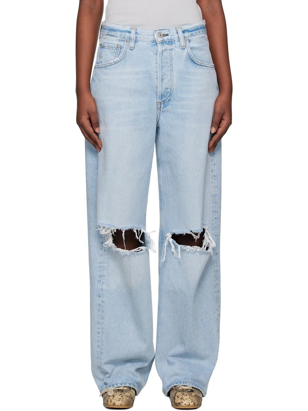 Heavyweight non-stretch regenerative cotton-blend denim jeans. Distressing, fading, and whiskering throughout. · Loose-fit · Mid-rise · Belt loops and logo flag at waistband · Five-pocket styling · Button fly · Rip at knees · Leather logo patch at back waistband · Logo-engraved silver-tone hardware · Contrast stitching in tan Part of the HUMANITY collection. Supplier color: Pagoda 67% regenerative cotton, 22% lyocell, 11% post-consumer recycled cotton. Made in Turkey 251030F069053