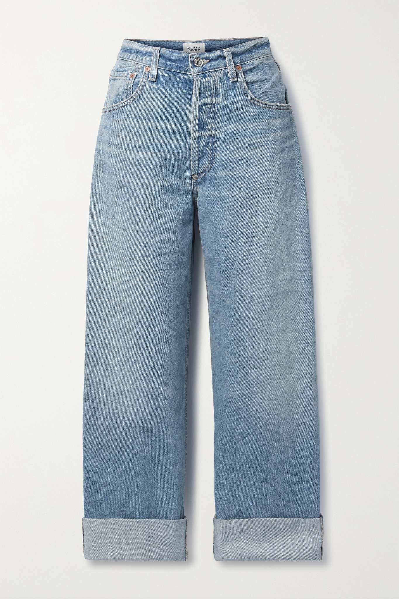EDITORS'NOTES Citizens of Humanity's 'Ayla Baggy' jeans are made from faded and whiskered light-blue organic denim contrasted by gold topstitching. They're designed in a classic five-pocket construction and have a high-rise waist and wide legs that you can roll at the cuffs. This product was created using Considered Materials. Find out more about NET SUSTAIN here. SIZE & FIT - Fits true to size, however those who are between sizes should take the smaller size - High-rise, cut for a wide-leg fit - Mid-weight, non-stretchy fabric - Size 28 jeans have an inside leg of 26”/ 66 cm - Model is 175cm/ 5'9" and is wearing a size 28 DETAILS & CARE - Light-blue organic denim - Partially concealed button fastenings - 100% organic cotton - Machine wash - Designer wash: Skylights