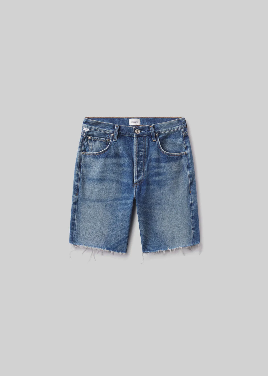 The Ayla Short, inspired by our best-selling Ayla Baggy, offers the perfect balance of ease and versatility. Designed with a relaxed fit and a just-right inseam, it transitions effortlessly from beachside lounging to an elevated evening look. Crafted from 100% regenerative cotton, this essential short pairs seamlessly with denim shirting for a chic, head-to-toe statement. This fit is true to size. Looks Like: Medium to dark indigo denim short with fading and whiskering Feels Like: Rigid denim made from regenerative cotton to give a soft hand feel This product is made with regenerative cotton from Citizens of Humanity Group’s Regenerative Cotton Program. Our program collaborates closely with farmers both domestically and internationally, nurturing growth, fostering education, and encouraging the widespread adoption of regenerative agricultural practices. Eco-Indigo is a first-of-its-kind, high-performance textile dye. It transforms renewable resources like sugar through fermentation and green chemistry to create vibrant, lasting COLOR. This groundbreaking process reduces energy consumption, CO₂ emissions, and dependence on fossil fuels, thus help preserving our environment. Now applied to our regenerative cotton denim, Eco-Indigo is coloring the way for a more sustainable future. From our HUMANITY Collection DETAILS Closure: Button Fly Rise: 12" Inseam: 10" Leg Opening: 23 1/2" Model is 5'10 and wearing a size 27 Fabric Content: 100% Regenerative Cotton Care Instructions: Machine wash cold inside out with like colors. Do not bleach. Tumble dry low. Made in Turkey with imported materials 2118-1810_CHAYA