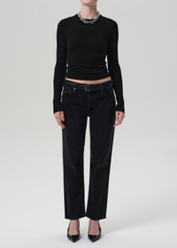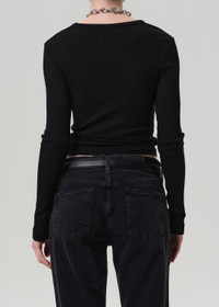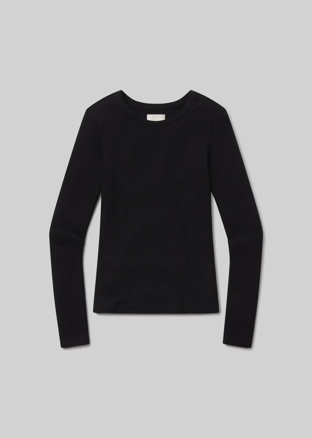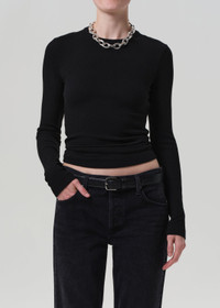 An elevated everyday essential, the Bina Crewneck is crafted from super-soft sweater rib with the perfect hint of stretch. The true black hue and slim, long sleeve silhouette offer a clean, streamlined look. Ideal for layering or wearing solo with denim or soft tailoring. This fit is true to size. Looks Like: True black long sleeve crewneck Feels Like: Super soft sweater rib with the perfect amount of stretch From our HUMANITY Collection DETAILS Body Length: 24 1/4" Sleeve Length: 25 1/2" Model is 5'10" and wearing a size Small Fabric Content: 67% Lyocell 29% Organic Cotton 4% Spandex Care Instructions: Machine wash cold inside out with like colors. Do not bleach. Tumble dry low. Made in USA with imported materials 9320-1576_BLK
