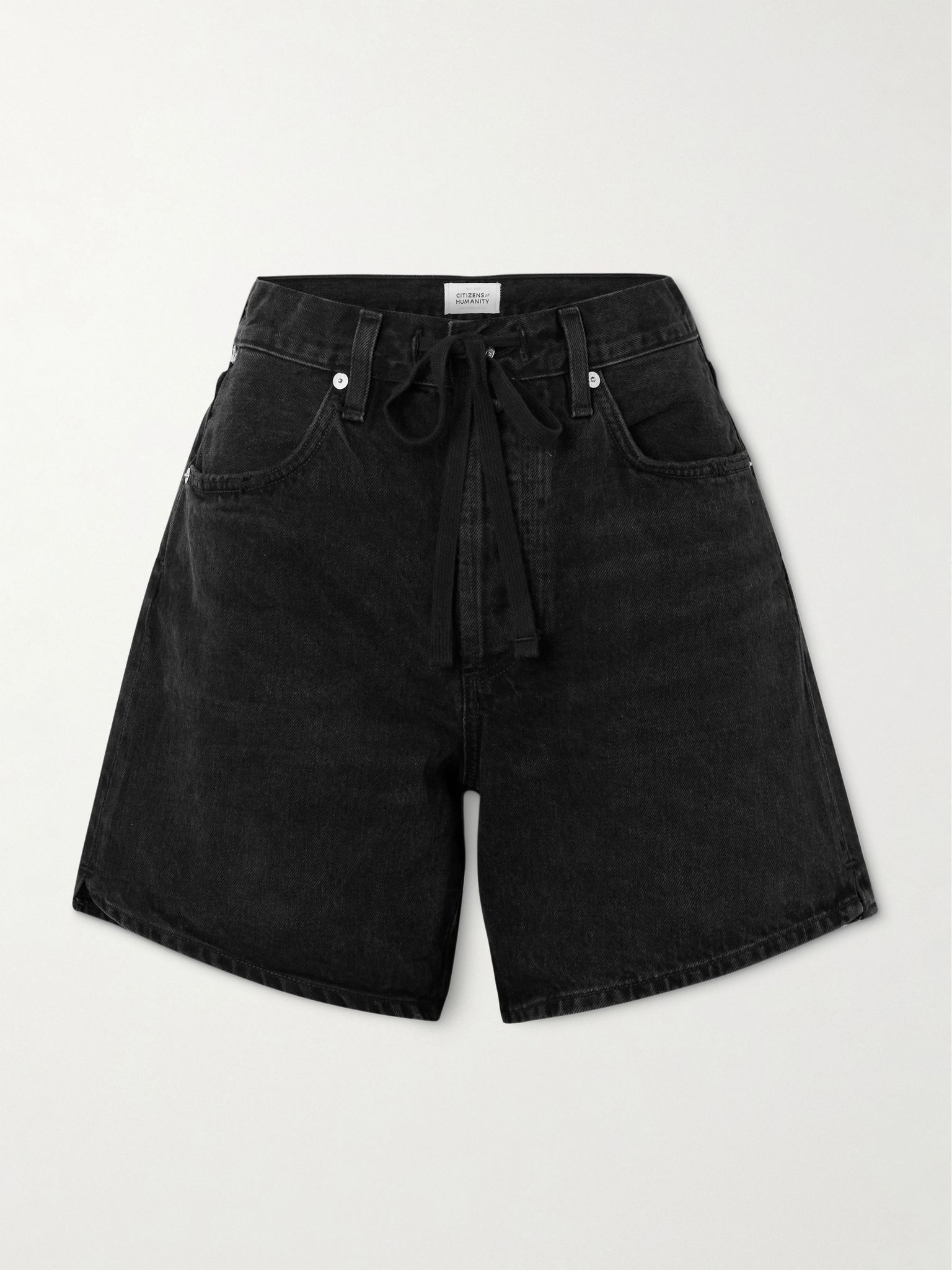 Citizens of Humanity's 'Brynn' shorts have a drawstring waist, playing on athleisure style. Cut from denim in a 'Midnight Sky' wash, they have a high rise and relaxed, wide legs. Lower-Impact Materials. This product is made using at least 50% lower-impact materials or ingredients. Find out more about our NET SUSTAIN criteria here. Size & Fit - Fits true to size, take your normal size - High-rise, intended for a boxy fit - Drawstring waist, designed for a flexible fit - Mid-weight, non-stretchy denim - Model is 177cm/ 5'10" and is wearing a size 25 Model measurements: - Bust: 79cm/ 31" - Waist: 63cm/ 25” - Hip: 90cm/ 35.5” Details & Care - Black denim - Partially concealed button fastenings along front - 100% cotton - Machine wash - Designer wash: Midnight Sky - This product has been made with regenerative cotton, supporting holistic farming practices that increase soil health, improve biodiversity and reduce carbon emissions