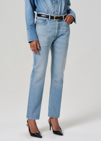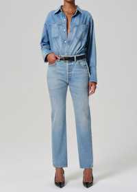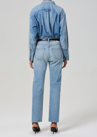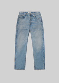 The ‘Blaine’ is a high-rise, vintage-inspired straight leg designed with a clean ankle-length inseam. The ‘Gemini’ wash is a pale indigo with soft fading, marbling, and whiskering—offering a sun-washed, lived-in look. Crafted from rigid regenerative cotton with a soft hand, it’s a light-wash essential that pairs effortlessly with everything from oversized knits to simple tanks. This fit is true to size. Looks Like: Light indigo denim pant Feels Like: Rigid, non-stretch cotton denim with a soft hand for all day wearability This product is made with regenerative cotton from Citizens of Humanity Group’s Regenerative Cotton Program. Our program collaborates closely with farmers both domestically and internationally, nurturing growth, fostering education, and encouraging the widespread adoption of regenerative agricultural practices. From our HUMANITY Collection DETAILS Closure: Button Fly Rise: 11 1/2" Inseam: 29" Leg Opening: 15 1/4" Model is 5'10" and wearing a size 27 Fabric Content: 100% Regenerative Cotton Care Instructions: Machine wash cold inside out with like colors. Do not bleach. Tumble dry low. Made in Turkey with imported materials 2197-3041_GMINI
