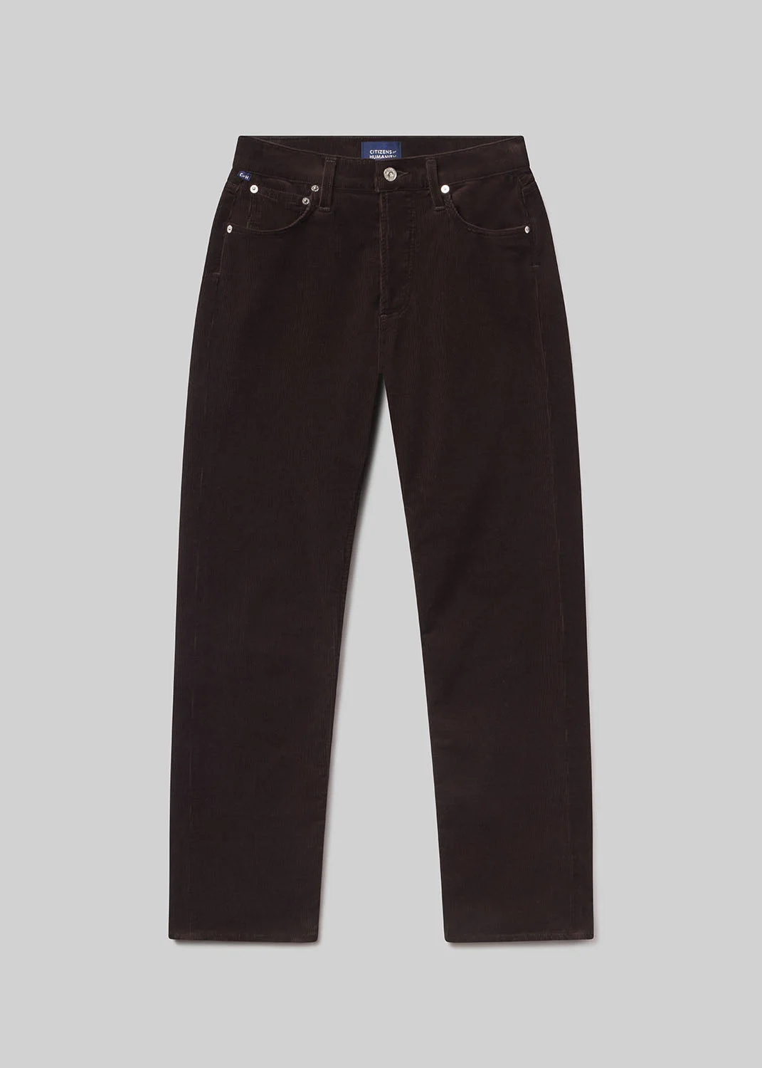 The ‘Blaine’ features a high-rise, vintage-inspired straight leg with an ankle-grazing inseam for a clean, timeless look. This version is crafted from soft, midweight corduroy in a deep brown hue, with slight stretch for added comfort. Style with a relaxed knit or structured jacket for an effortless, everyday uniform. This fit is true to size. Looks Like: Dark brown corduroy pant Feels Like: Smooth, soft midweight corduroy with slight stretch for all day comfort From our HUMANITY Collection DETAILS Closure: Button Fly Rise: 11 5/8" Inseam: 29 1/2" Leg Opening: 15 1/4" Model is 5'10" and wearing a size 27 Fabric Content: 98% Cotton 2% Elastane Care Instructions: Machine wash cold inside out with like colors. Do not bleach. Tumble dry low. Made in Turkey with imported materials 2197-1449_BSTER