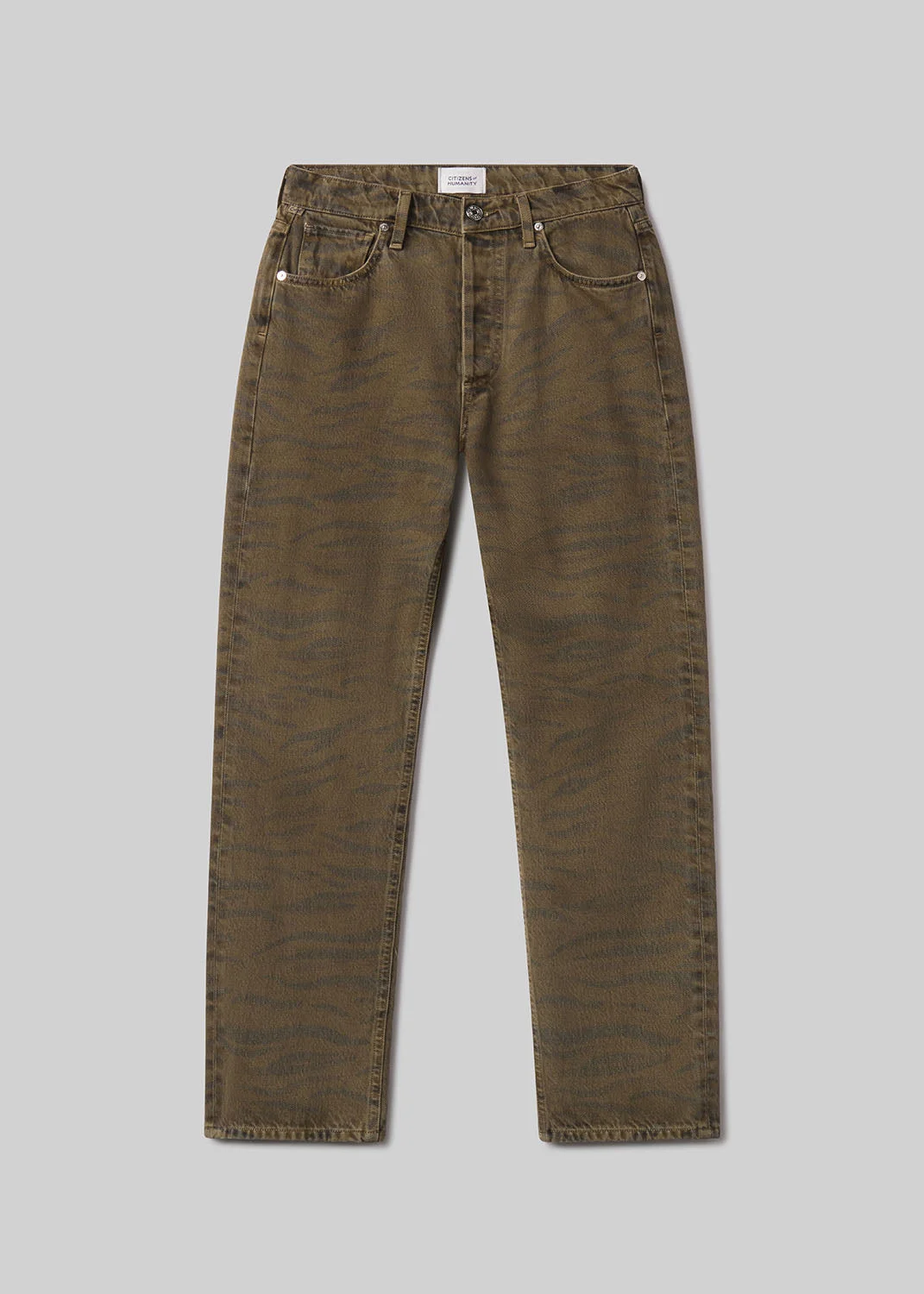 The ‘Blaine’ is a high-rise, vintage-inspired straight leg with an ankle-length inseam and effortless structure. The ‘Medina’ wash is rich brown with zebra print, crafted from non-stretch denim that’s washed down for a lightweight, ultra-soft feel. Style with relaxed tailoring or a slim knit for an elevated, everyday look. This fit is true to size. Looks Like: Brown denim pant with zebra print Feels Like: Non-stretch, weightless denim washed down for a super soft feel From our HUMANITY Collection DETAILS Closure: Button Fly Rise: 11 1/4" Inseam: 29 1/2" Leg Opening: 15 1/4" Model is 5'10" and wearing a size 27 Fabric Content: 100% Cotton Care Instructions: Machine wash cold inside out with like colors. Do not bleach. Tumble dry low. Made in USA with imported materials 2197B-1248PR_OLVZB