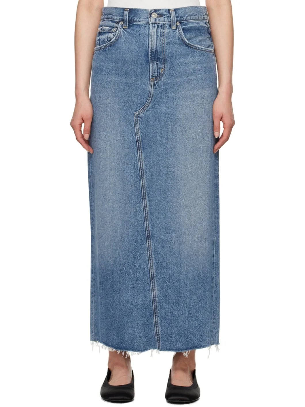 Non-stretch lyocell- and pre-consumer recycled cotton denim skirt. Fading, whiskering, and subtle distressing throughout. · Belt loops · Five-pocket styling · Zip-fly · Raw edge at hem · Logo flag at outseam · Leather logo patch at back waistband · Central vent at back hem · Contrast stitching in tan Supplier color: Glisten/Light indigo 70% lyocell, 30% pre-consumer recycled cotton. Made in United States 241030F092001
