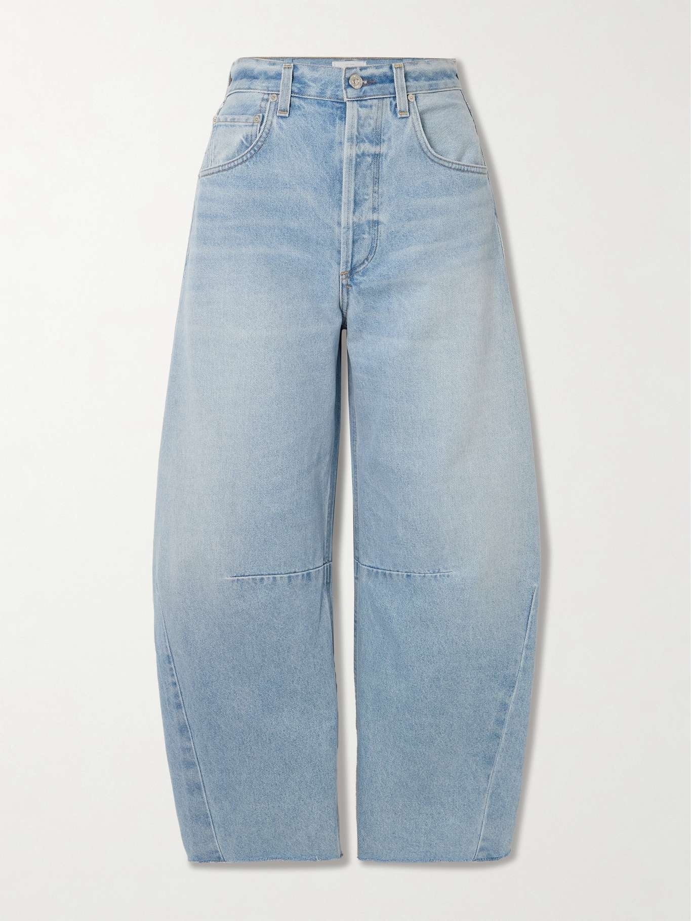 EDITORS'NOTES Citizens of Humanity's 'Horseshoe' jeans get their name from the dramatically curved shape of the wide legs. Made from panels of light-wash denim that are gently faded, they sit high on the waist and fall to frayed cuffs. Wear yours with sleek flats to balance the proportions. SIZE & FIT Model measurements: - Fits true to size, take your normal size - High-rise, cut for a wide-leg fit - Mid-weight, non-stretch fabric - Size 26 jeans have an inside leg of 65"/25.5cm - Model is 177cm/ 5'10" and is wearing a size 26 - Bust: 81cm/ 32" - Waist: 62cm/ 24.5" - Hip: 89cm/ 35" DETAILS & CARE - Light-blue denim - Partially concealed button fastenings at front - 100% cotton - Machine wash - Designer wash: Gemini