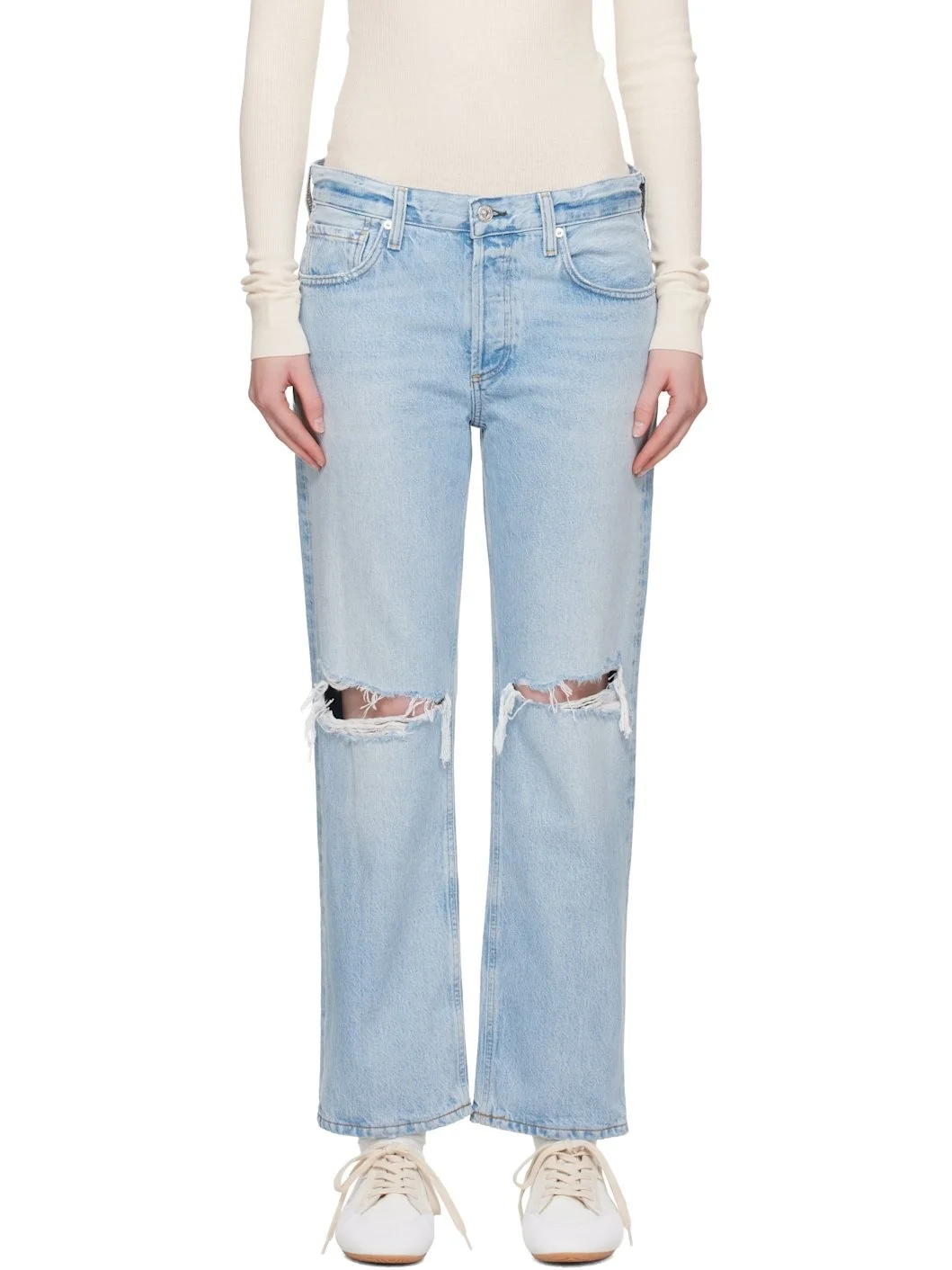 Non-stretch regenerative cotton- and recycled lyocell-blend denim jeans. Fading, whiskering, and distressing throughout. · Straight-leg and relaxed-fit · Low-rise · Belt loops · Five-pocket styling · Button fly · Rip at knees · Logo patch at outseam · Leather logo patch at back waistband · Logo-engraved silver-tone hardware · Contrast stitching in tan Supplier color: Pagoda 67% regenerative cotton, 22% recycled lyocell, 11% post-consumer recycled cotton. Made in Turkey 251030F069052
