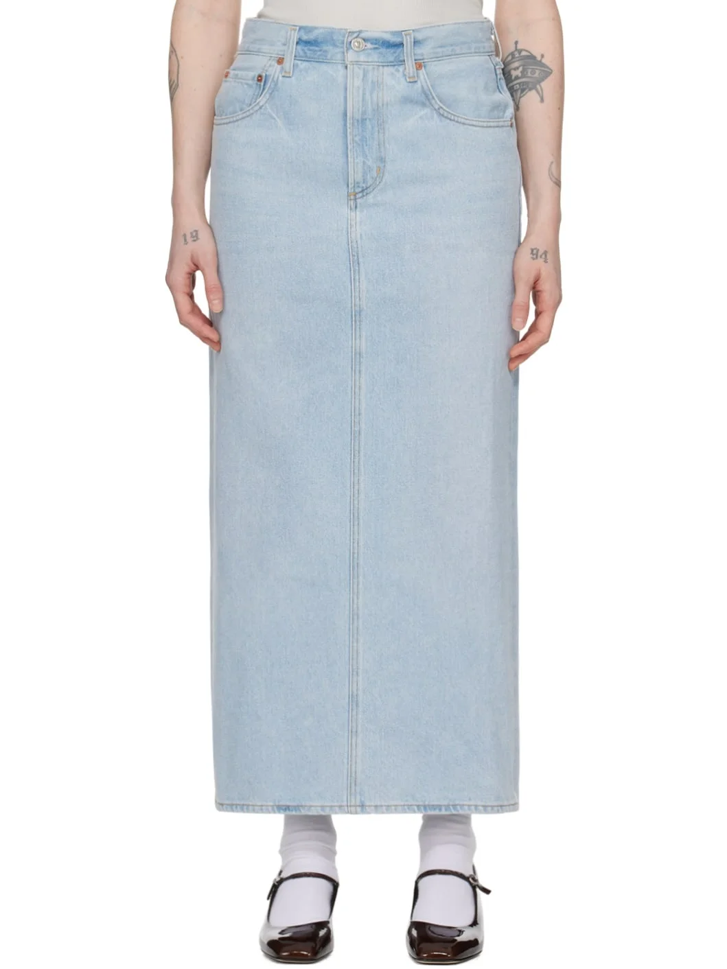 Non-stretch denim skirt. Fading throughout. · Belt loops · Five-pocket styling · Zip-fly · Logo flag at waistband · Leather logo patch at back waistband · Central vent at back hem · Logo-engraved silver- and bronze-tone hardware · Contrast stitching in tan Part of the HUMANITY collection. Supplier color: Frequency