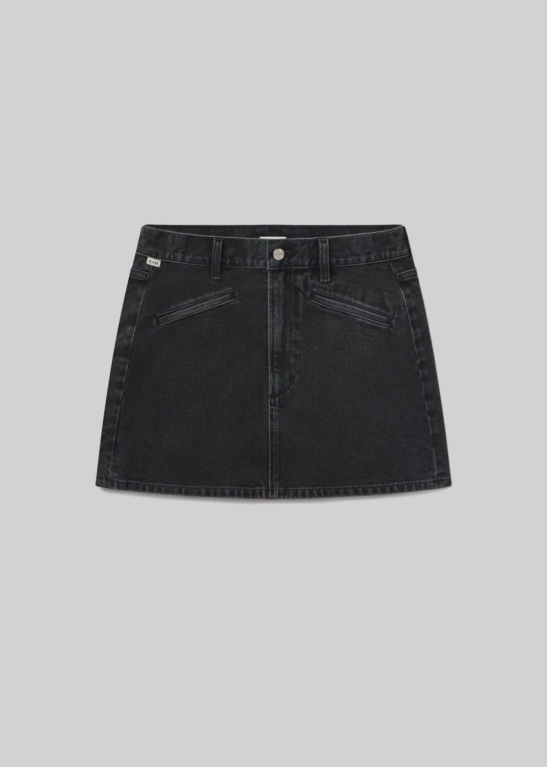 Classic mini silhouette, complete with welt pockets. Cut with a slim fit and finished hem. This fit is true to size. Looks Like: Washed black skirt with clean hem and trouser pocket detailing Feels Like: Comfort stretch, archive denim with a super soft hand for all day wearability From our HUMANITY Collection DETAILS Closure: Zipper Fly Length: 15" Hip: 39 1/2" Sweep: 42 3/4" Model is 5'10" and wearing a size 27 Fabric: 98% Cotton 2% Polyurethane Care Instructions: Machine wash cold. Made in USA with imported materials 3191-3010_METER