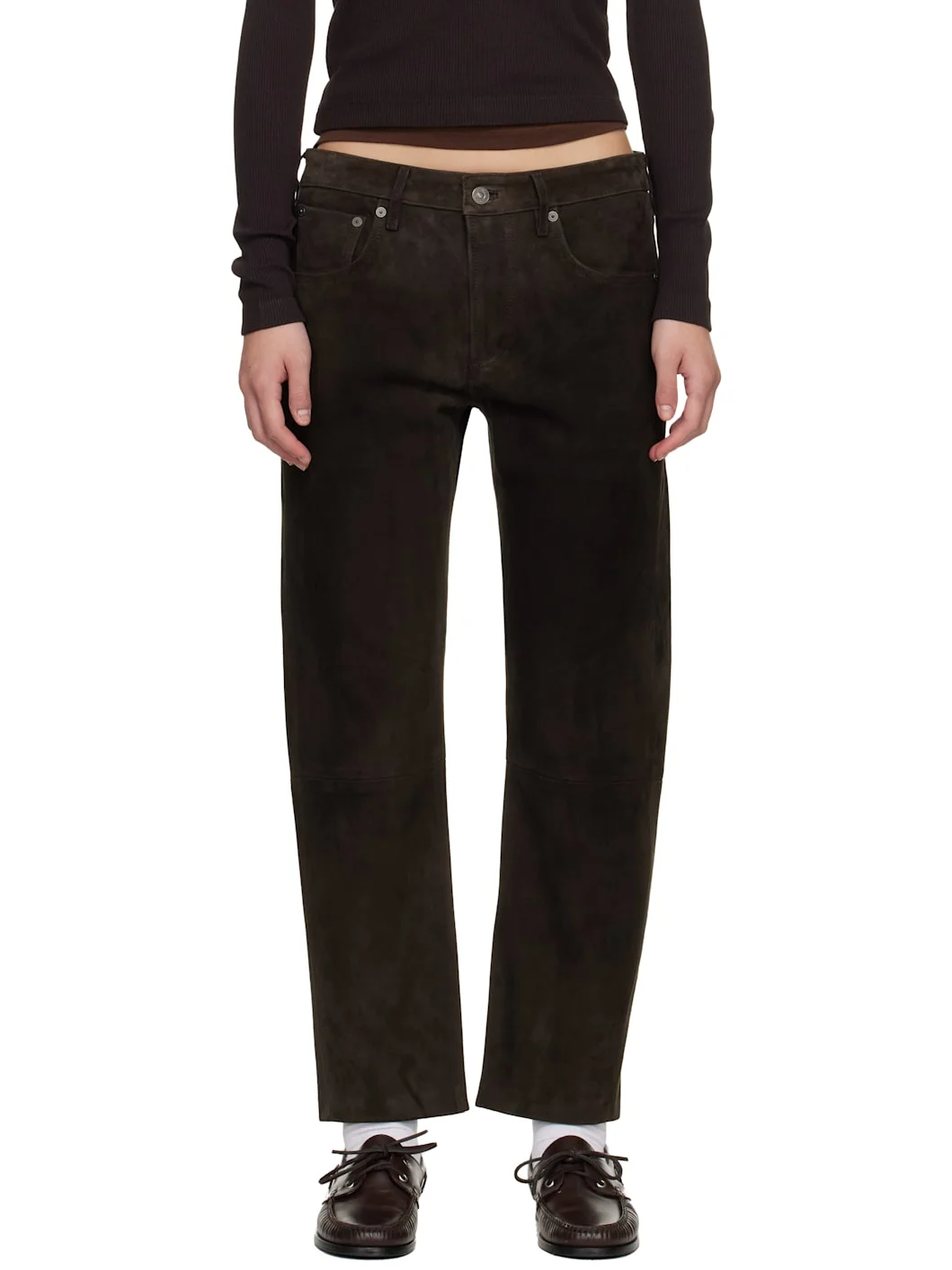 Goatskin suede trousers. · Low-rise · Belt loops · Five-pocket styling · Zip fly · Logo flag at outseam · Logo-engraved gunmetal-tone hardware Supplier color: Chocolate 100% goatskin. Made in Turkey 261030F084000