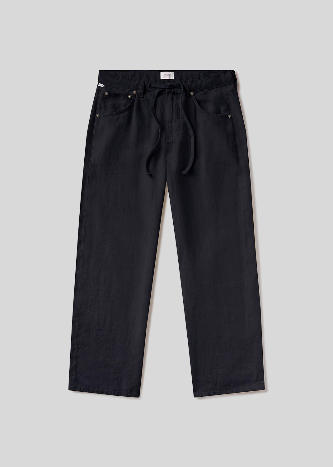 The Brynn Drawstring Trouser offers a relaxed fit with a comfortable drawstring waist, making it the perfect laid-back linen pant. Effortlessly stylish, this versatile trouser pairs beautifully with tonal linen pieces or a matching tank for a chic, coordinated look ideal for warm weather days and vacation-ready escapes. This fit is true to size. Looks Like: True navy linen trouser with drawstring detail Feels Like: Breathable lightweight linen From our HUMANITY Collection DETAILS Closure: Zip Fly Rise: 12 1/2" Inseam: 30 1/2" Leg Opening: 21 1/2" Model is 5'10" and wearing a size 27 Fabric: 100% Linen Care Instructions: Machine wash cold inside out with like colors. Do not bleach. Tumble dry low. Made in USA with imported materials 2144-1761_TNAVY