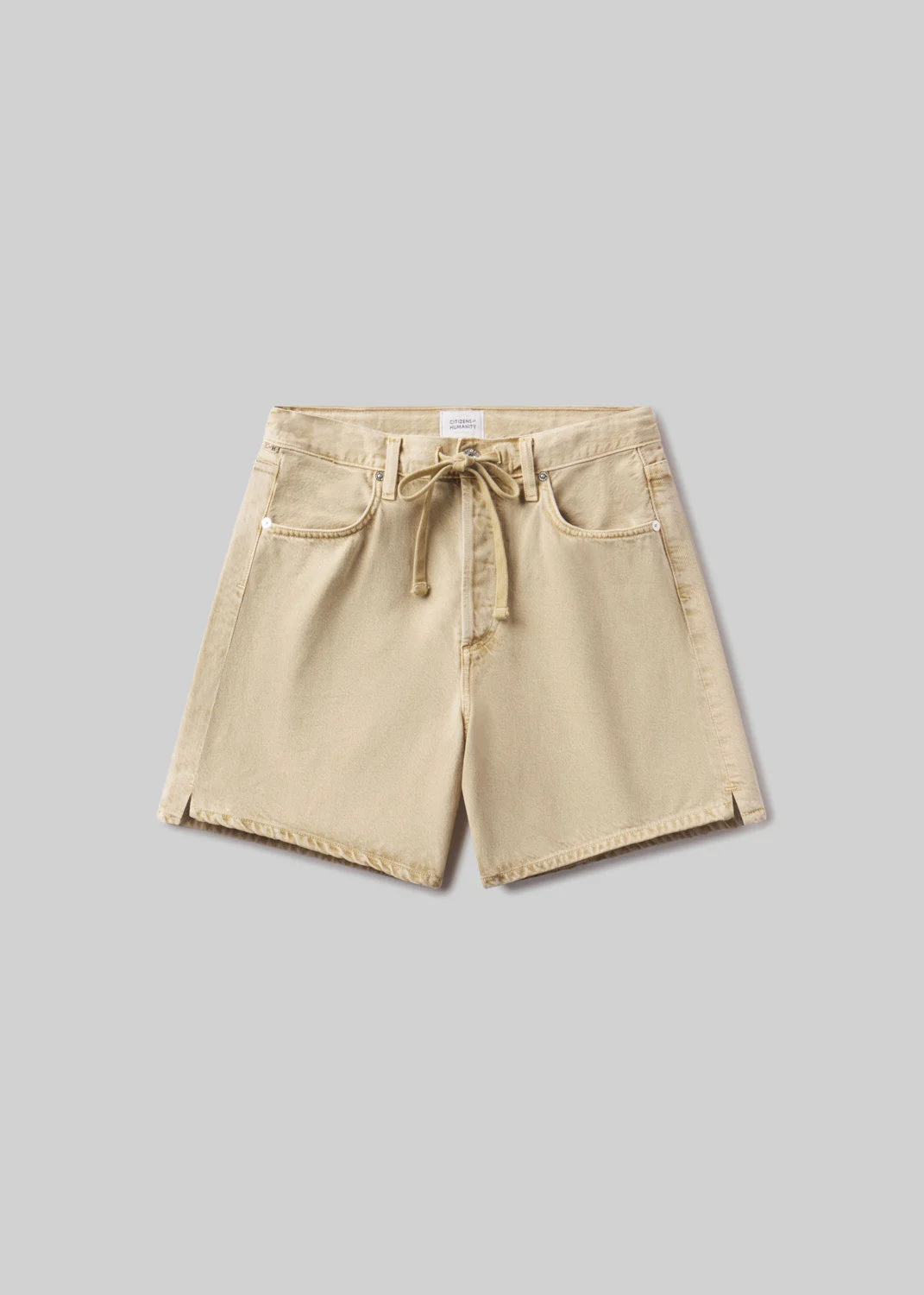 The Brynn Drawstring Short offers a relaxed, easy fit that’s perfect for warm weather and vacation-ready style. Crafted from lightweight denim, these shorts provide a versatile, understated look. Pair them with tonal linen pieces or a matching tank for a coordinated, effortlessly chic outfit that’s perfect for laid-back days and sunny escapes. This fit is true to size. Looks Like: Medium beige denim short with drawstring detail Feels Like: Rigid, non-stretch breathable cotton blend with a soft hand feel From our HUMANITY Collection DETAILS Closure: Button Fly Rise: 12" Inseam: 6 1/2" Leg Opening: 25" Model is 5'10 and wearing a size 27 Fabric Content: 65% Lyocell 35% Cotton Care Instructions: Machine wash cold inside out with like colors. Do not bleach. Tumble dry low. Made in USA with imported materials 2135-1664_HMPSD