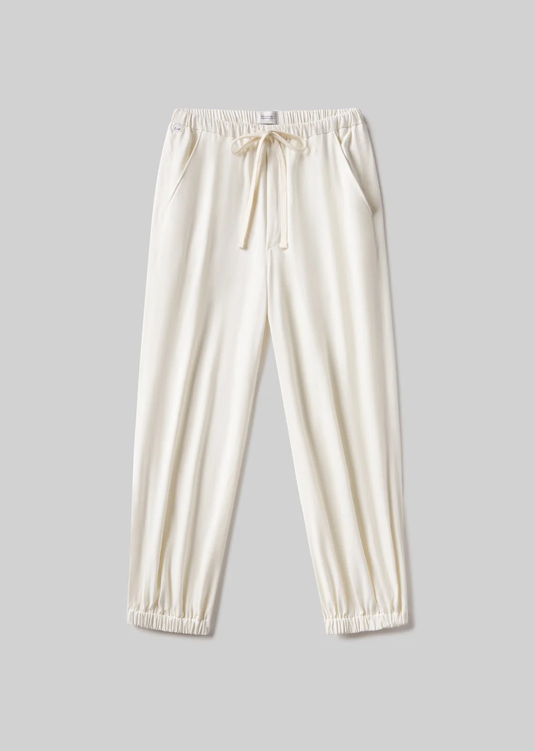 The Bubble Hem Pull-On Pant combines relaxed ease with refined design. Crafted from Italian twill, it features a comfortable drawstring waist, cuffed ankles, and a softly structured drape. Effortlessly versatile, it pairs beautifully with tonal separates or a matching tank for a polished, vacation-ready look. This fit is true to size. Looks Like: Light cream pant with elastic at the hem and drawstring closure Feels Like: Super luxurious and smooth twill with gentle texture and sheen From our HUMANITY Collection DETAILS Rise: 11 3/4" Inseam: 26 1/2" Leg Opening: 11" Model is 5'10" and wearing a size Small Fabric Content: 86% Viscose 12% Virgin Wool 2% Elastane Care Instructions: Machine wash cold inside out with like colors. Do not bleach. Tumble dry low. Made in Portugal with imported materials 2279-1905_MONLT