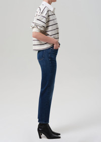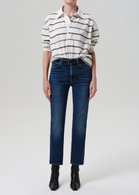 The Caia is a high-rise straight leg designed for everyday ease, crafted from soft stretch denim with a lightweight, flexible feel. The streamlined silhouette sits high on the waist and falls to an ankle-skimming length. The Ambry wash—a medium to dark indigo with soft fading and whiskering—offers a timeless, worn-in look. Perfect paired with crisp shirting or easy knits. This fit is true to size. Looks Like: Medium to dark indigo denim pant Feels Like: Soft, stretch denim with a lightweight feel This product is made with regenerative cotton from Citizens of Humanity Group’s Regenerative Cotton Program. Our program collaborates closely with farmers both domestically and internationally, nurturing growth, fostering education, and encouraging the widespread adoption of regenerative agricultural practices. From our HUMANITY Collection DETAILS Closure: Zip Fly Rise: 11" Inseam: 27 1/2" Leg Opening: 14 3/8" Model is 5'10" and wearing a size 27 Fabric Content: 81% Regenerative Cotton 11% Lyocell 6% Polyester 2% Elastane Care Instructions: Machine wash cold inside out with like colors. Do not bleach. Tumble dry low. Made in Turkey with imported materials 2173D-1691_AMBRY