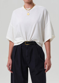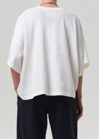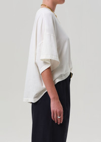 The Cape Tee is an everyday essential, crafted from ultra-soft, lightweight organic cotton jersey. Designed with a relaxed fit and subtle drape, it feels effortless and easy. Perfect with vintage denim or layered under tailoring. This fit is true to size. Looks Like: Off white short sleeve tee Feels Like: Lightweight ultra soft jersey cotton This product is made with regenerative cotton from Citizens of Humanity Group’s Regenerative Cotton Program. Our program collaborates closely with farmers both domestically and internationally, nurturing growth, fostering education, and encouraging the widespread adoption of regenerative agricultural practices. From our HUMANITY Collection DETAILS Body Length: 24 3/4" Chest: 56 1/2" Sleeve Length: 6 1/2" Model is 5'10" and wearing a size Small Fabric Content: 100% Regenerative Cotton Care Instructions: Machine wash cold inside out with like colors. Do not bleach. Tumble dry low. Made in USA with imported materials 9437-3050_PMINA