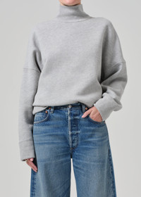 A timeless essential made for the modern wardrobe. Knitted with a luxe, cozy feel, this relaxed sweater features a ribbed turtleneck and cuffs. Wear yours with denim or tailoring. This fit is true to size. Looks Like: Light grey turtleneck sweater Feels Like: Breathable cotton fleece with enough stretch for all-day wearability DETAILS Body Length: 26" Chest: 51" Sleeve Length: 17 1/2" Model is 5'10" and wearing a size Small Fabric Content: 72% Cotton 28% Polyester Care Instructions: Machine wash cold inside out with like colors. Do not bleach. Tumble dry low. Made in USA with imported materials 9392-1445_HTHRG