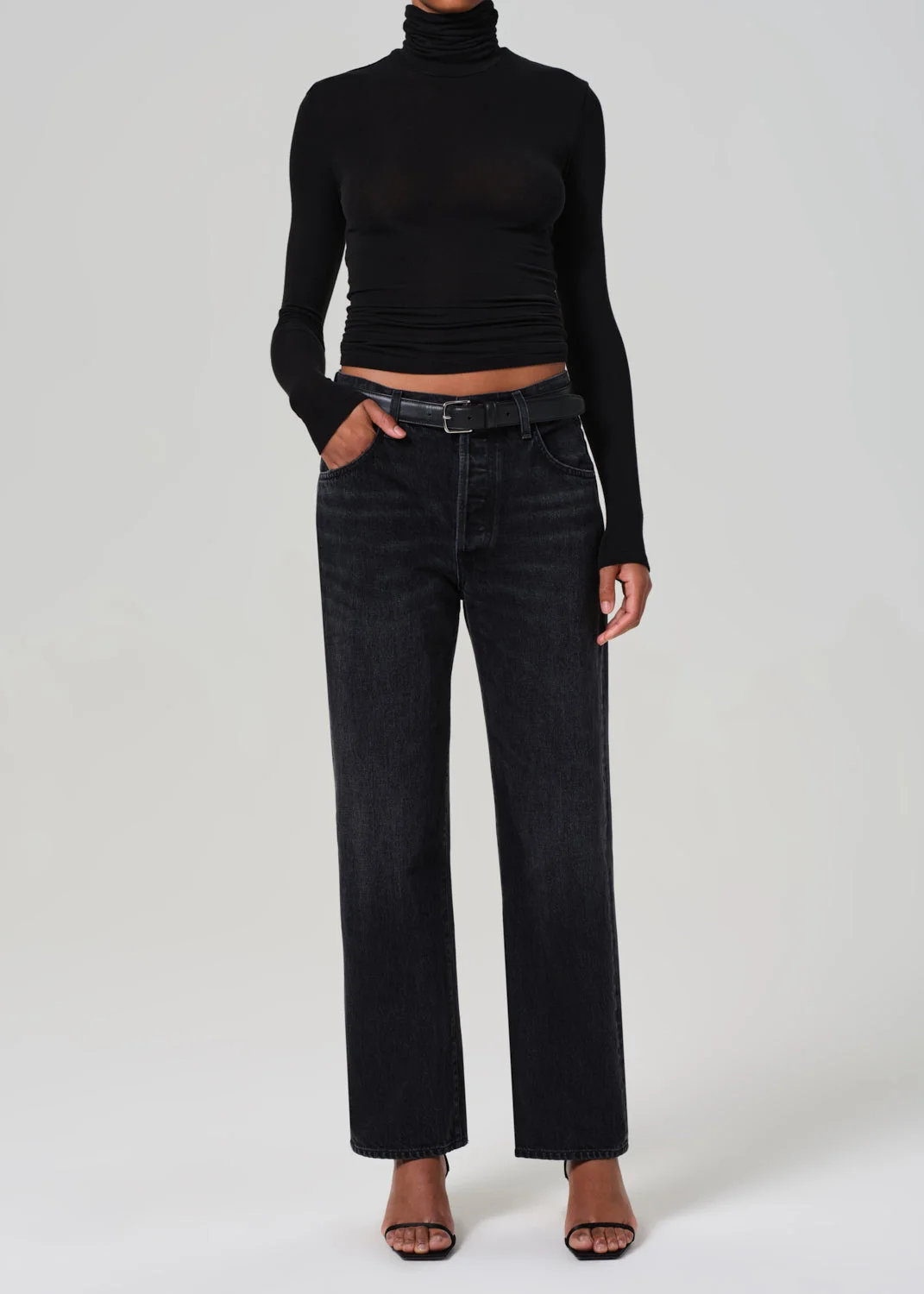 A refined foundation piece, the Caradene Turtleneck is crafted from super-soft sweater rib with just the right amount of stretch. The slim silhouette offers a clean, polished look—ideal layered under tailoring or worn solo with denim. This fit is true to size. Looks Like: True black long sleeve turtleneck shirt Feels Like: Ultra-soft, lightweight fine needle baby rib From our HUMANITY Collection DETAILS Body Length: 23" Chest: 26" Model is 5'10" and wearing a size Small Fabric Content: 94% Lyocell 6% Spandex Care Instructions: Machine wash cold inside out with like colors. Do not bleach. Tumble dry low. Made in USA with imported materials 9407-3060_BLK