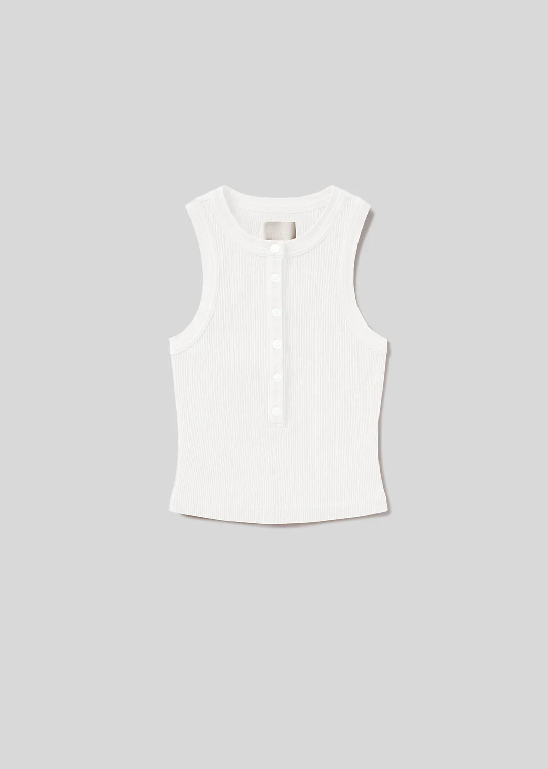 An elevated essential, the Caralyn Tank is crafted from ultra-soft, supportive rib made with regenerative cotton. The sleeveless silhouette features a clean button front and a slim fit that flatters with ease. Perfect layered under shirting or worn solo with denim. This fit is true to size. Looks Like: Off white button front sleeveless tank Feels Like: Ultra soft and supportive ribbed cotton From our HUMANITY Collection DETAILS Body Length: 20 1/2" Chest: 25 1/2" Model is 5'10" and wearing a size Small Fabric Content: 49% Regenerative Cotton 49% Lyocell 2% Spandex Care Instructions: Machine wash cold inside out with like colors. Do not bleach. Tumble dry low. Made in USA with imported materials 9435-3004_PMINA