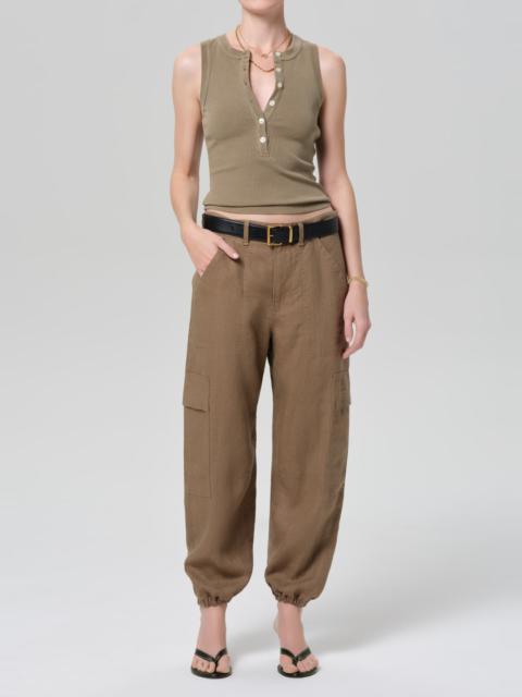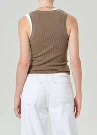 An elevated essential, the Caralyn Tank is crafted from ultra-soft, supportive rib made with regenerative cotton. The sleeveless silhouette features a clean button front and a slim fit that flatters with ease. Perfect layered under shirting or worn solo with denim. This fit is true to size. Looks Like: Medium brown henley tank with grey undertones Feels Like: Ultra soft and supportive ribbed cotton This product is made with regenerative cotton from Citizens of Humanity Group’s Regenerative Cotton Program. Our program collaborates closely with farmers both domestically and internationally, nurturing growth, fostering education, and encouraging the widespread adoption of regenerative agricultural practices. From our HUMANITY Collection DETAILS Body Length: 20 1/2" Chest: 25 1/2" Model is 5'10" and wearing a size Small Fabric Content: 49% Regenerative Cotton 49% Lyocell 2% Spandex Care Instructions: Machine wash cold inside out with like colors. Do not bleach. Tumble dry low. Made in USA with imported materials 9435-3004_COCA