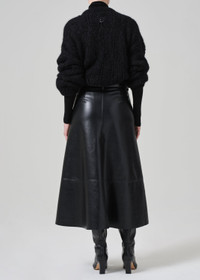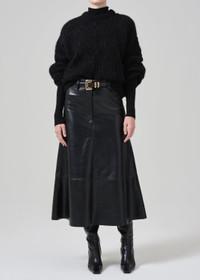 A modern classic, the Cassia is a sleek A-line skirt crafted from buttery recycled leather with a touch of stretch for effortless wear. The true black hue and clean silhouette offer timeless versatility with a refined edge. Style it with soft knits, structured shirting—or pair it back to the matching leather top for a full-set statement. This fit is true to size. Looks Like: Luxurious true black leather a-line skirt Feels Like: Buttery, genuine recycled leather with slight stretch for ease From our HUMANITY Collection DETAILS Closure: Zip Fly Length: 34" Hip: 39" Sweep: 73" Model is 5'10" and wearing a size 27 Fabric: 50% Recycled Leather, 30% Polyurethane, 10% Viscose, 10% Polyester Care Instructions: Dry clean only. 3187-3013_BLK