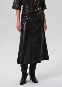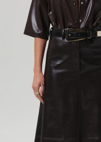 The Cassia is a refined A-line skirt cut from buttery recycled leather with a hint of stretch for ease. In rich Chocolate brown, the silhouette feels both classic and modern, offering versatile styling from day to night. Pair it with crisp shirting or complete the look with the matching leather top for a full-set finish. This fit is true to size. Looks Like: Luxurious chocolate brown leather a-line skirt Feels Like: Buttery, genuine recycled leather with slight stretch for ease From our HUMANITY Collection DETAILS Closure: Zip Fly Sweep: 73" Model is 5'10" and wearing a size 27 Fabric Content: 50% Recycled Leather, 30% Polyurethane, 10% Viscose, 10% Polyester Care Instructions: Dry clean only. Made in USA with imported materials 3187-3013_CHO